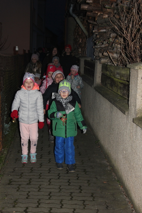 Odpoledne se pomalu mění v podvečer a šero ve tmu, v které jsou dobře vidět svíčky naší svíčkové cesty. Jdeme na krásně rozsvícenou náves v Lipí a po celou pouť nás provází cinkání zvonečků.