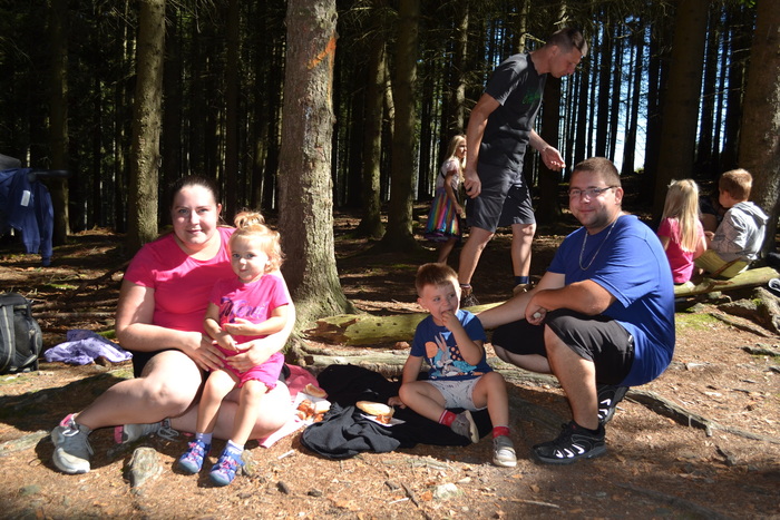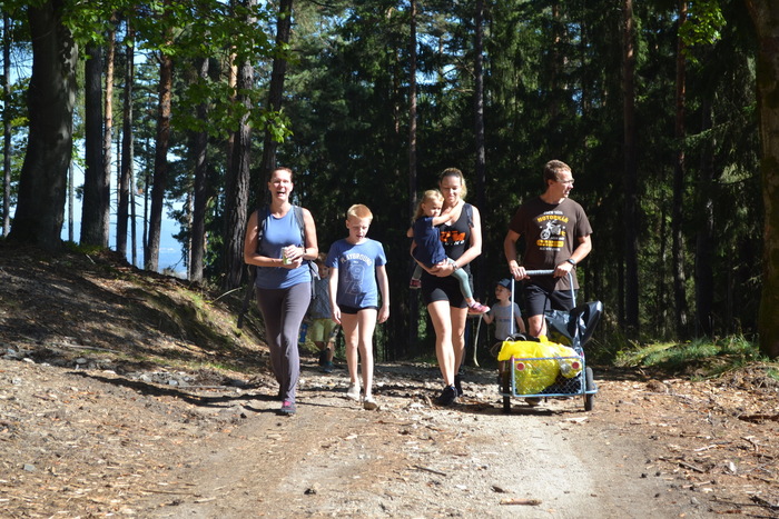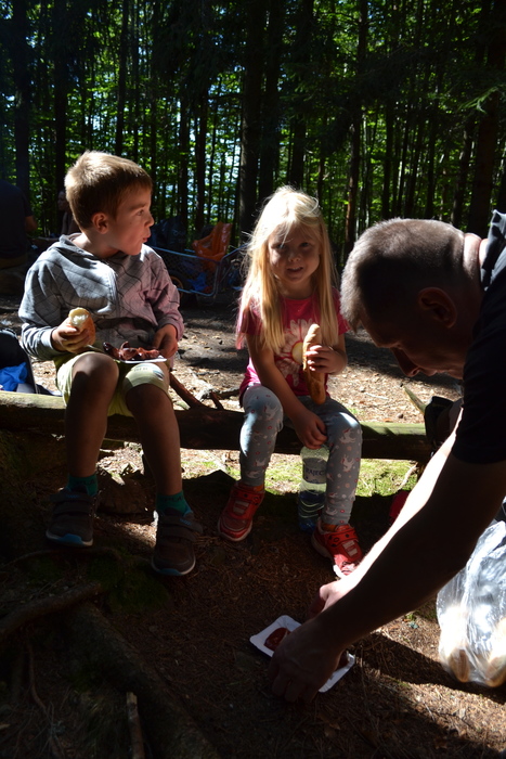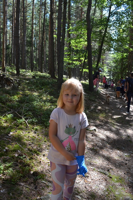Pytel na odpadky se plní rychle a než dojdeme k sezení za vodárnou, tak je plný. Tady je čas na první pauzu, první svačinku a první perníčky. Další cestu volíme co nejpohodlnější, ale do kopce to prostě je. Místo, kde je kopec nejprudší, je trochu kamenným endurem a čekáme, že bude i prubířským kamenem, jež vytřídí silné jádro pokračující dál, od těch, kteří náročný výstup vzdají. Silné jádro jsme všichni! Úplně všichni! Dokonce i naše Sluníčka a rodiče tlačící kočárek s malou Zuzankou. Hluboká poklona a klobouk dolů. Nejhorší máme za sebou, přesto nás stále ještě čeká stoupání. Trocha únavy už je na pár jedincích znát, ale jsou i tací, kteří neúnavně pobíhají. Při stoupání k vysílači u Kozího kamene nechápu, kde děti tu energii berou. U vysílače si opět trochu oddechneme, což někteří potřebují víc a jiní míň. Někteří neodpočívají vůbec a lítají po lese. Maminky a tatínkové to nejsou. Perníčky tety Zuzky jdou na dračku a nálada je výborná, neb víme, že teď už nás k cíli dovede rovina. V okolí stezky nacházíme místo odpadků hříbky. Považujeme za velikou výhru, že nám stačí jen dva pytle a že v kárce se místo odpadků může vézt Viktorka.