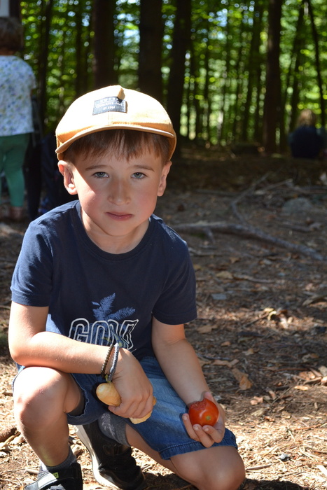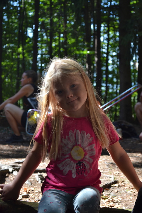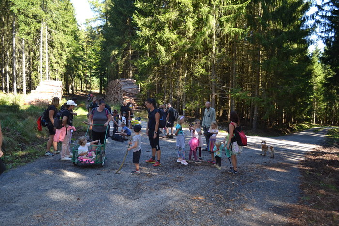 V sedle se trochu roztrháme, neb někteří to mají domů blíž jinou cestou a někteří už trochu chvátají, ale stále nás je slušná banda. Pohodlnou cestu nádherným smíšeným lesem si užíváme a přijde čas na povídání. Třeba o tom, jak se maminka ptala Viktorky, kterou paní učitelku má nejraději. Viktorka v tom má jasno: ,,tetu kuchařku“. Shodujeme se, že jí rozumíme. Takhle k poledni máme tetu kuchařku rády všechny.
