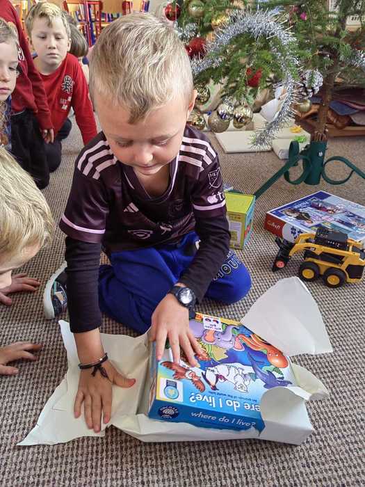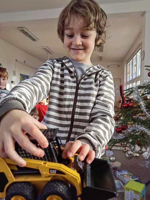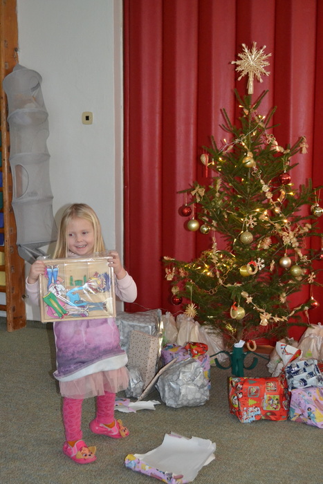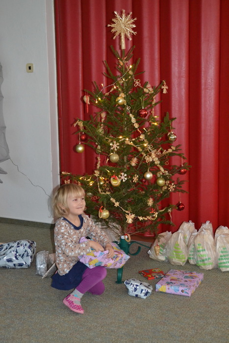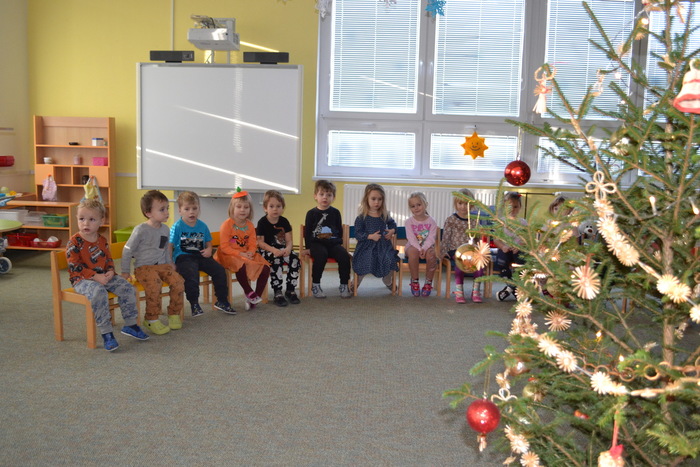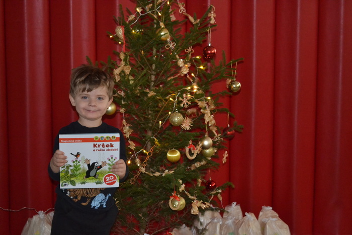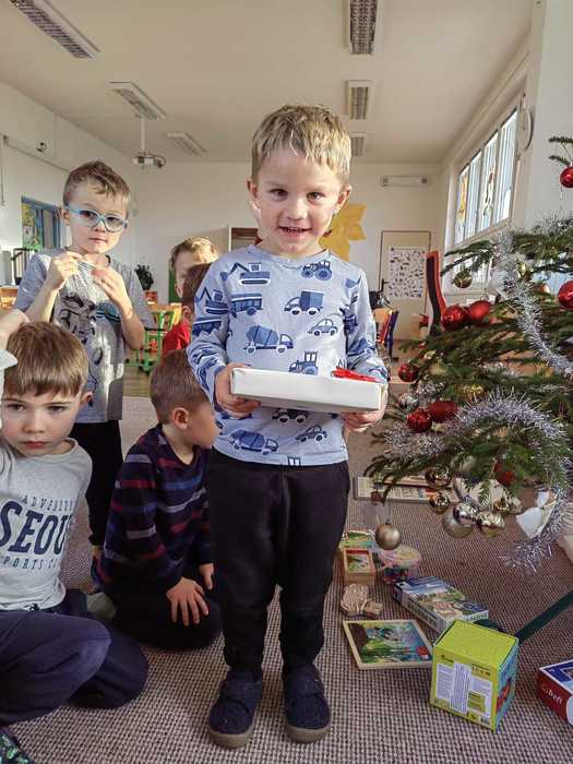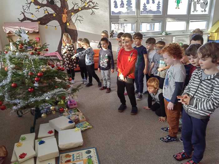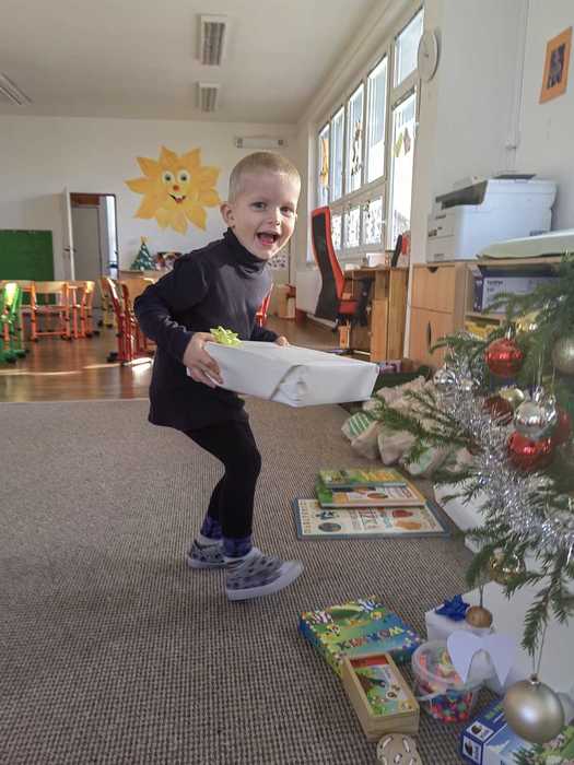 A tak nás, po návratu z procházky, čeká slavnostní překvapení. Celá třída voní perníčky, jablíčky, cukrovím, natěšením a radostí. Rozsvícený stromeček se hrdě tyčí nad hromadou dárků. Ani nedutáme, koukáme na to barevné nadělení, postupně dárky rozbalujeme a je nám moc krásně vánočně. Hlasitě zavoláme Ježíškovi poděkování z okna a těšíme se, že za pár dnů zavítá do našich domovů.