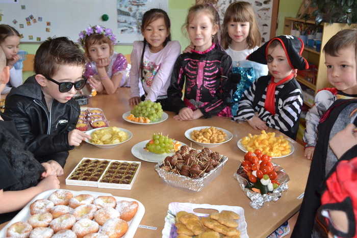 Neméně zajímavá podívaná byla na stoly, které nám maminky pomohly zaplnit. Vesele barevná bábovka vedle perníčkových traktorů a žraloků, masopustní koblihy, zeleninový a ovocný ježek…. Prostě dobroty výborné, a ještě k tomu krásné. Moc maminkám děkujeme. Dnešní maškarák jsme si moc užili.
