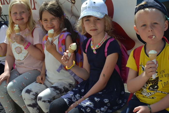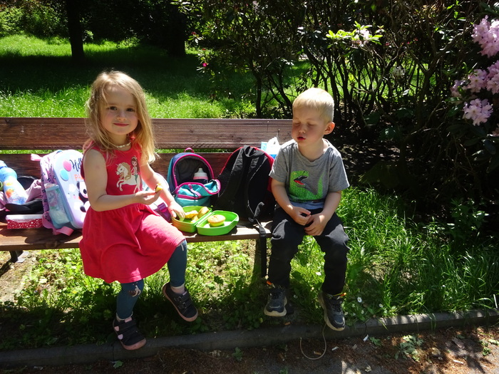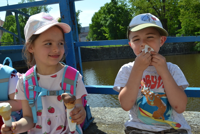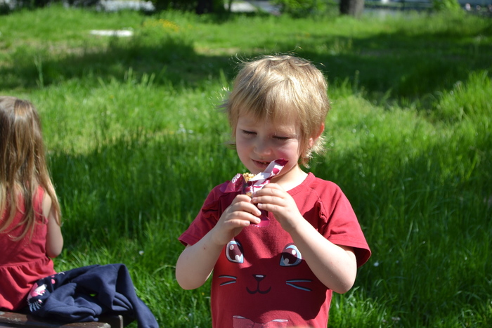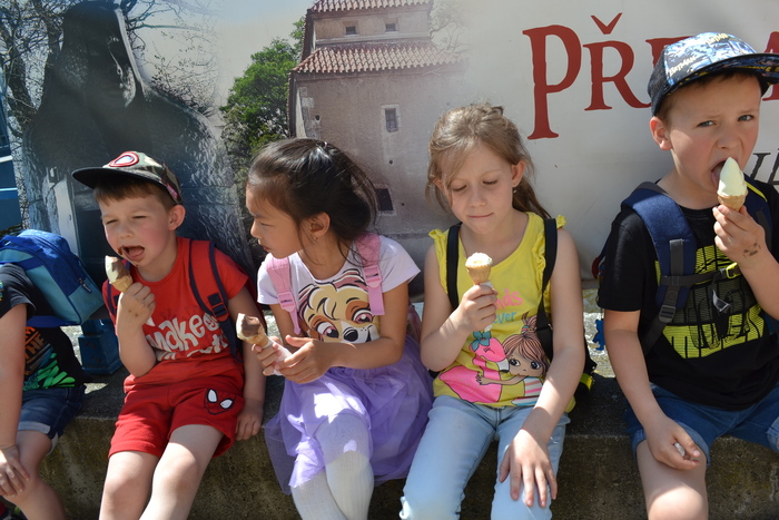 Všichni jsme se sešli venku, abychom provětrali batůžky s dobrotami a Kočičky si ještě stihly rychle doběhnout na zmrzlinu. Sluníčka o zmrzku nepřijdou, ale teď už by jí nestihla. Protože nám jede autobus, a ten, jak víme, nečeká. Zato nás ve školce čeká oběd a postýlky. A do těch už se všichni těšíme.