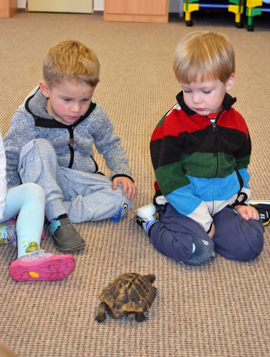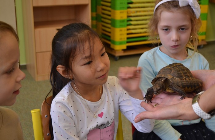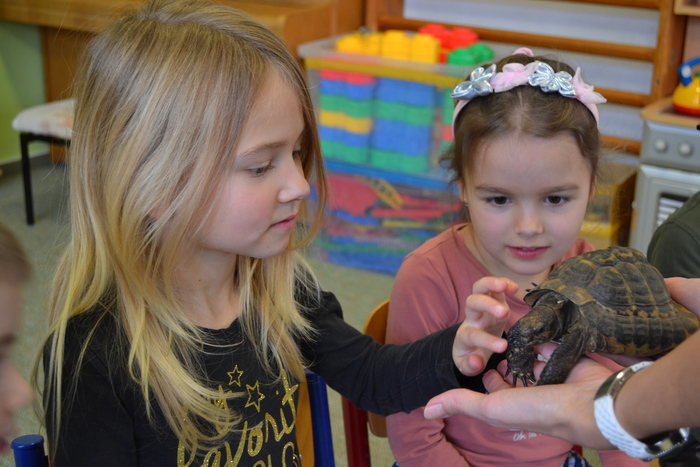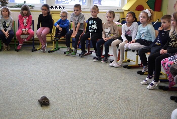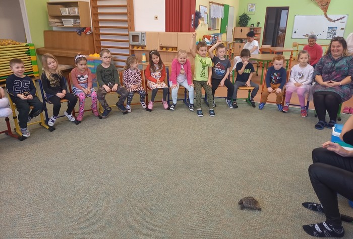 První zvířátko, které se nám ukázalo, byla dvanáctiletá suchozemská želva Žofka. Hned se několik z nás hlásilo, že želvu mají doma a že o ní mnohé vědí. A opravdu na otázky paní Míši padaly správné odpovědi. Želva si pochutnává na listech pampelišky, jitrocelu a spoustě dalších. I jablíčka jí chutnají a ne, loupat se nemusí. Vždyť přeci v přírodě jí je také nikdo neoloupe.