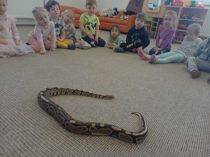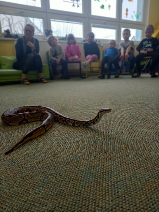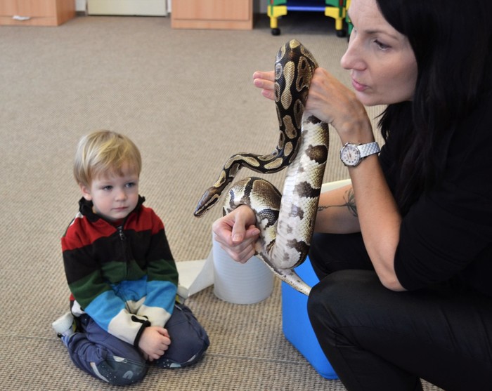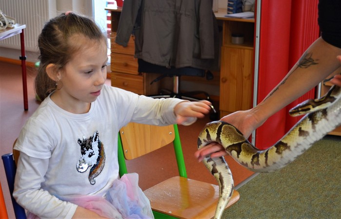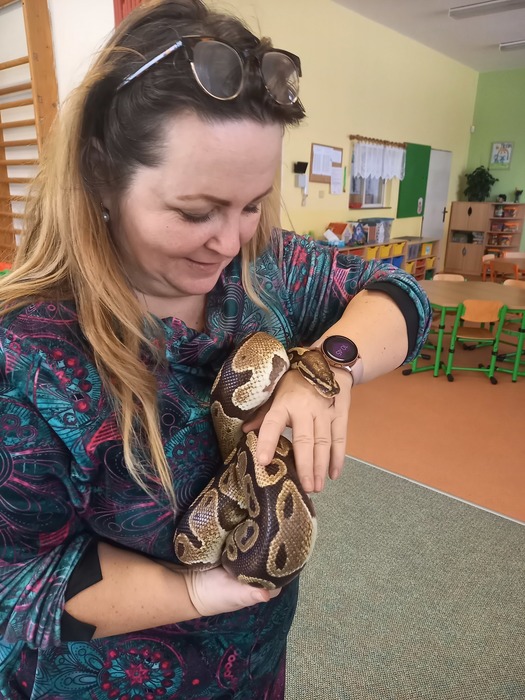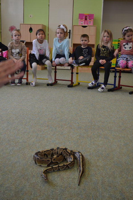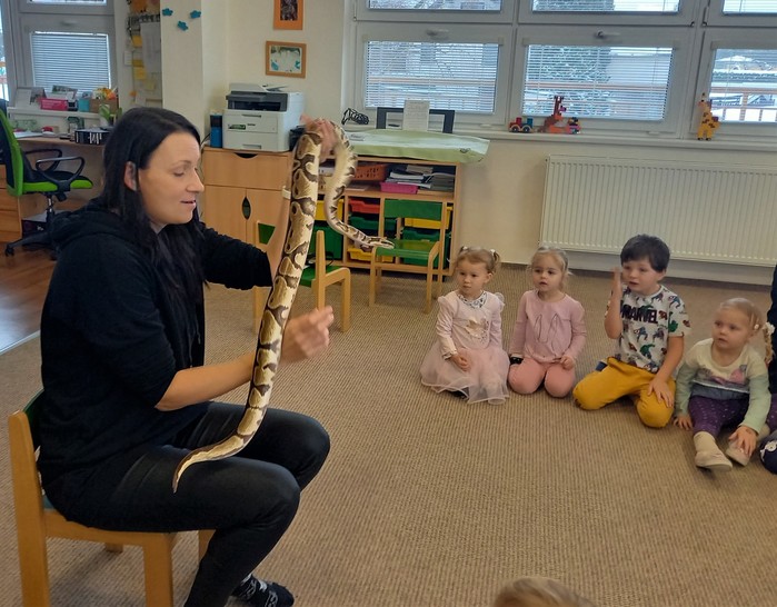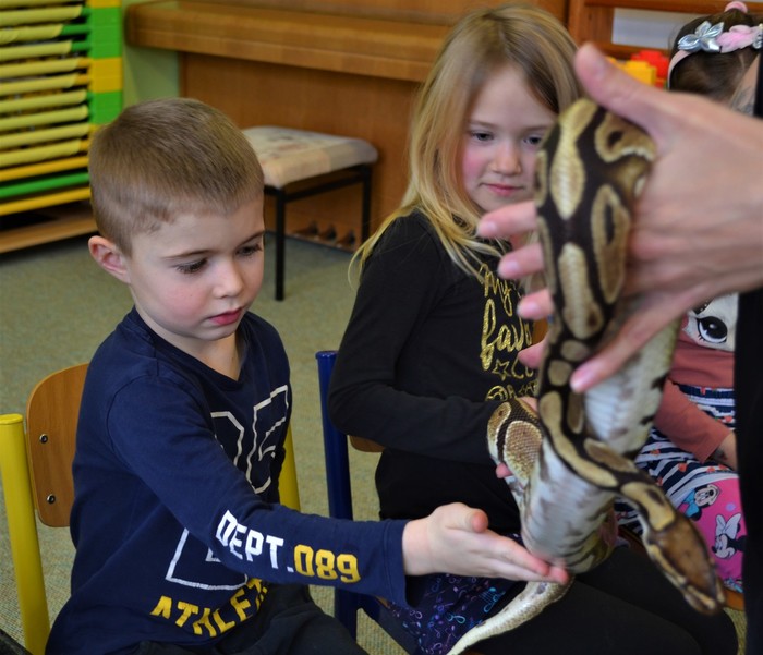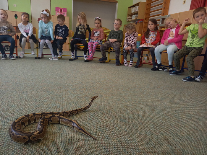 Což je rychle přešlo při otevření druhé přepravky. A je to tady! Kromě medvěda jsme se moc těšili na hada. A ono nám to vyšlo! Né že by se z bedýnky vyhrabal medvěd, ale velmi elegantně se okolo Míši ruky obtočil had. Né tak ledajaký had. Bylo nám ctí se seznámit s Mirečkem, krajtou královskou. Mireček, potomek afrických rodičů, se před třiadvaceti lety vylíhl z vajíčka už u nás. Mireček je starý pán, který během svého života navštívit spoustu školek a ví, co se sluší a patří. Pózuje na foto, prohlíží si nás, očuchává si nás rozeklaným jazykem a vůbec nesyčí. To znamená, že se necítí ohrožený, a je mu s námi fajn. V klídku se nechá pohladit, jen by se mu prý nelíbilo poplácávání po hlavičce. Dozvídáme se o hadech spoustu zajímavostí. Třeba, že baští jednou za měsíc. Mireček prý už svojí dávku myšek v lednu dostal, tak se těší na únor. A také, že má moc rád teplo, a že ho na procházku po zasněžené zahradě nemáme brát.