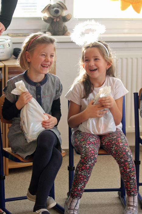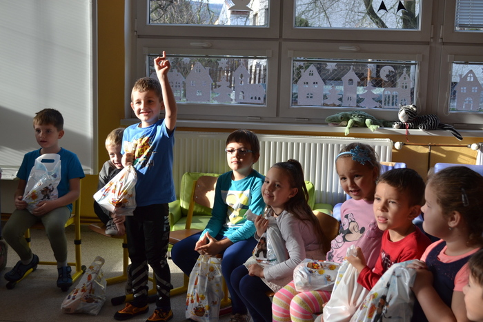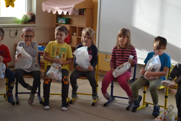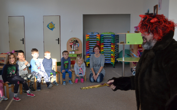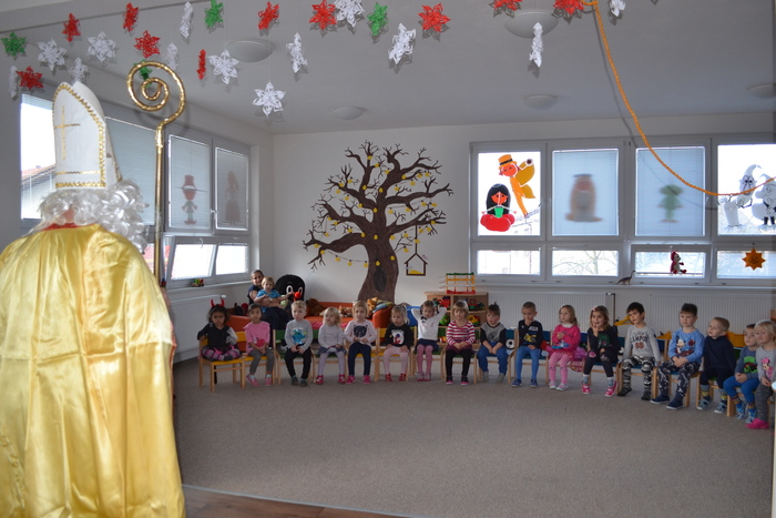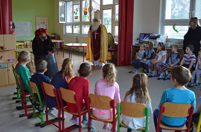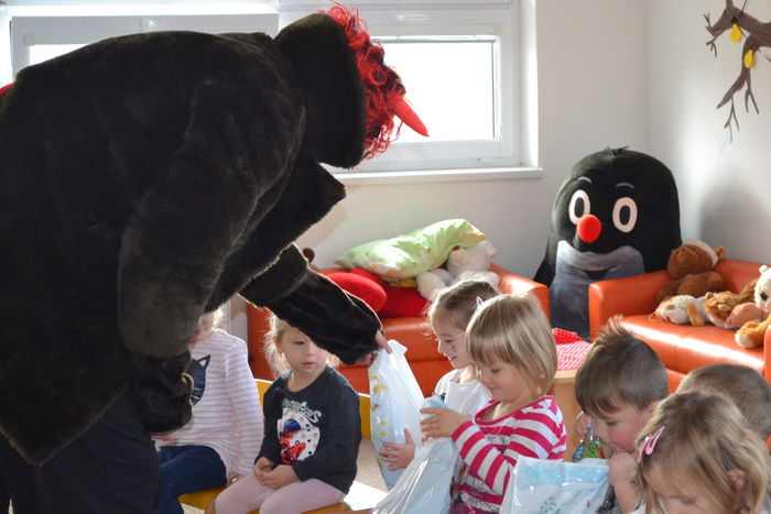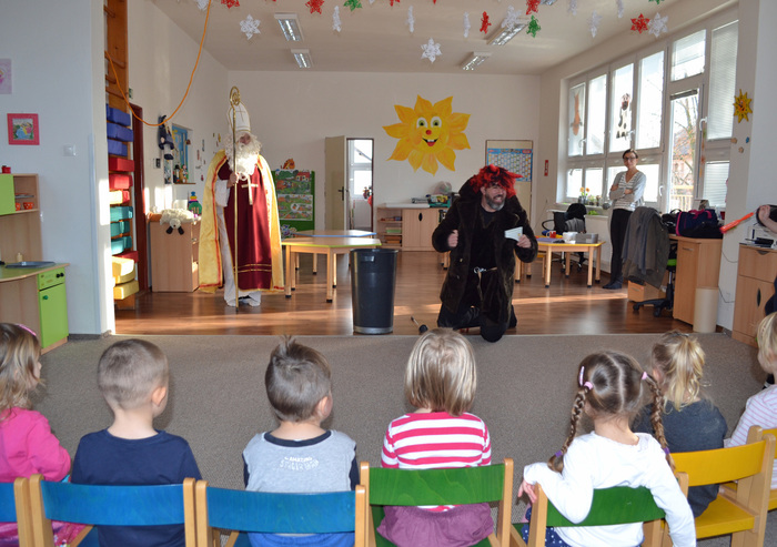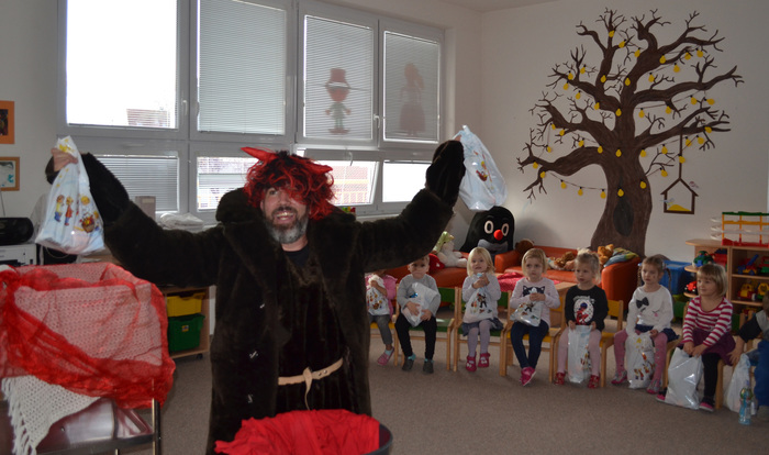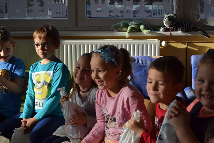 ,,Já už se v noci nepočůrávám“ špitl tichý hlásek, sotva se ve dveřích objevil pan Mikuláš. Pak teprve důstojný pán pozdravil, zeptal se jakpak se máme a poprosil nás, abychom mu pomohly zavolat pomocníka čerta. A že my se ani čertů nebojíme, tak jsme rády pomohly. Čert byl takový popletený umouněný hromotluk a z blýskavých očí mu koukalo dobro vůbec né pekelné, ale pěkně rošťácké. Tak s tímhle čertiskem bude legrace. A taky že byla. Pomotal co mohl a dokonce se nám snažil namluvit, že kýchnutím rozfoukal nadílku. Pěkně se přitom hladil po chlupatém bříšku. Potom předčítal z nějakého lejstra, že jsme prý hodné a těch pár připomínek k našemu chování vyřešil jak nejlépe mohl. Roztrhal lejstro a vše nemilé rozumě zahodil. Prý to bylo moc dlouhé. Konečně jsme se také dostaly ke slovu a mohly naší návštěvě zazpívat a zarecitovat a za to jsme se přeci jen ke kýžené nadílce dostaly. Ano, poděkovat jsme nezapomněly! Že k nám přišel Mikuláš trochu brzy? No to přeci nevadí a i tak se těšíme, že se ve čtvrtek opět uvidíme :-)