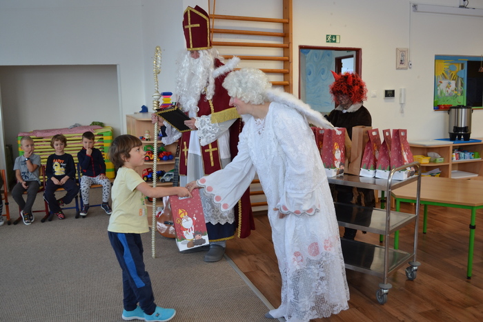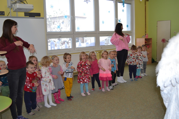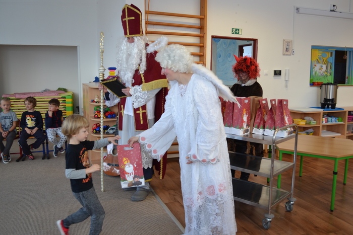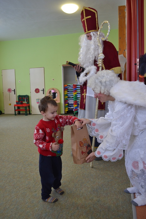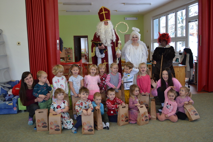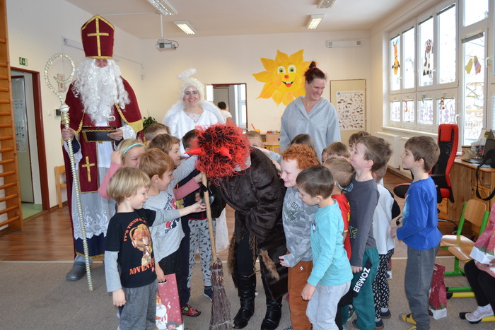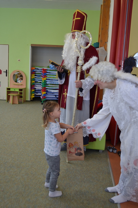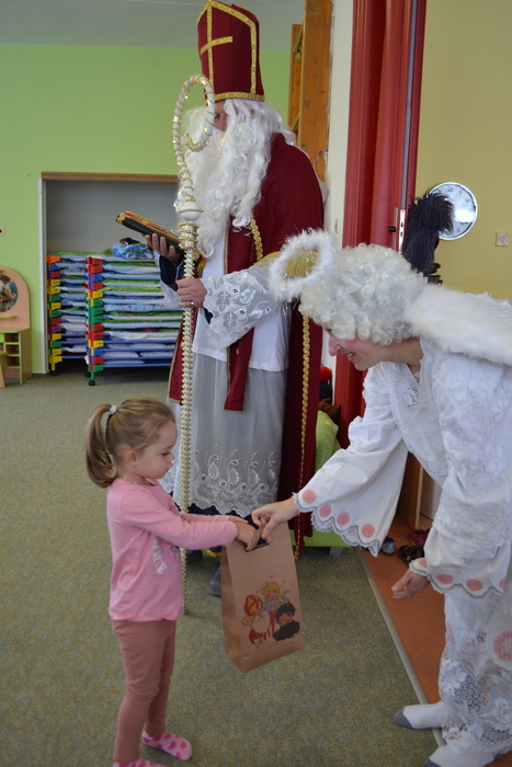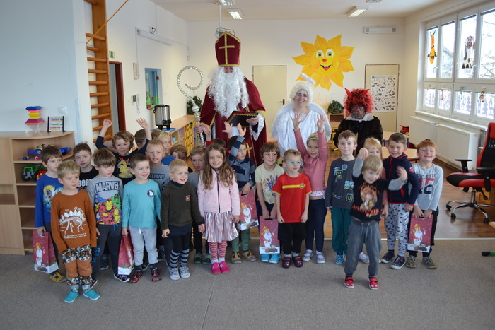 Zato pan Mikuláš, to vám byl vysoký důstojný pán. Mile se na nás ze své výšky usmíval a mluvil o nás velice hezky. Už dopředu věděl, že jsme moc hodné. Tak řekl krásnému andělovi, aby nám rozdal dárečky. Anděl se usmíval úplně andělsky a podaroval nás. Byla to moc milá návštěva a věříme, že večer k nám domů přijde návštěva stejně hodná.