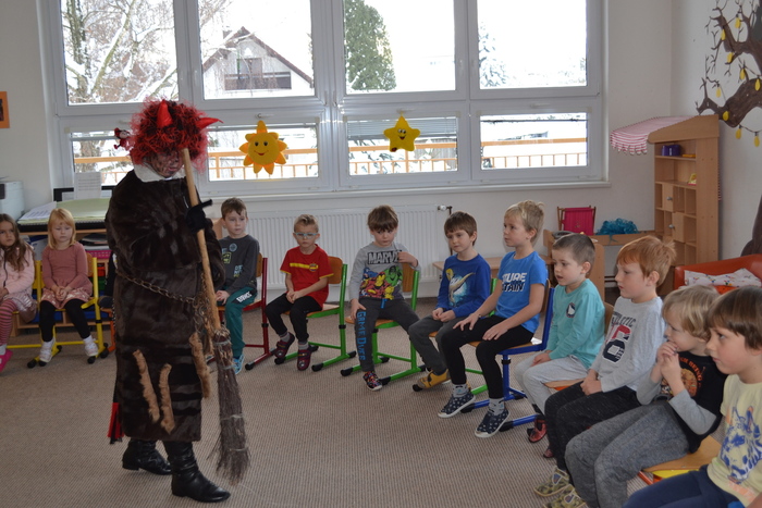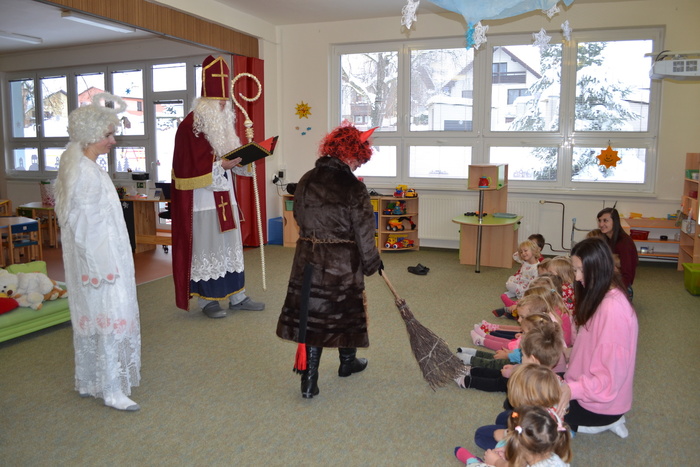 Tak jsme si letos trošku myslely, že se k nám dostaví jen Mikuláš s andělem bez čerta. Ale ouha, přihrnul se i čert. To nám někdo vysvětlete, kudy se z pekla těmi hromadami sněhu prokutal. Byl trochu nevrlý. To se ani nedivíme, vždyť ho muselo zábst kopyto. Možná byl nevrlý i proto, že zjistil, do jaké školky zavítal. Do školky plné hodných dětí. U Sluníček si jen tak pobrukoval pod vousy, že je tu úplně zbytečný. U Kočiček přeci jen trochu pookřál, ale i tady převládají děti hodné, pracovité a hlavně kamarádské. Asi to věděl dopředu, ani si nevzal pytel, kterým by nám hrozil. Tak jsme ho za to podrbaly na zádech a prý jsme mu tím vyhnaly blechy. Možná nějaké přineseme domů. Byla s ním docela zábava. Ono už to tak u čertů bývá. Bývají trochu mrzouti, ale jsou to vlastně rohatí dobráci v kožichu.