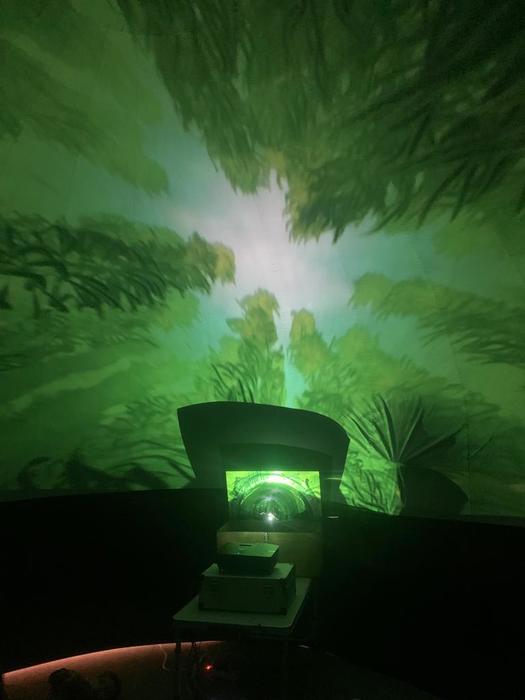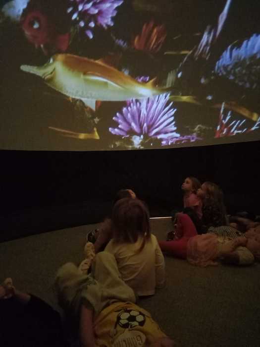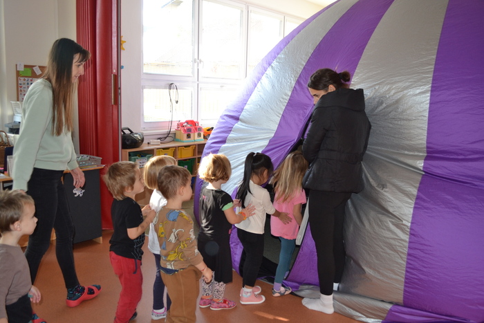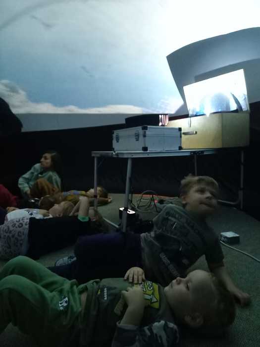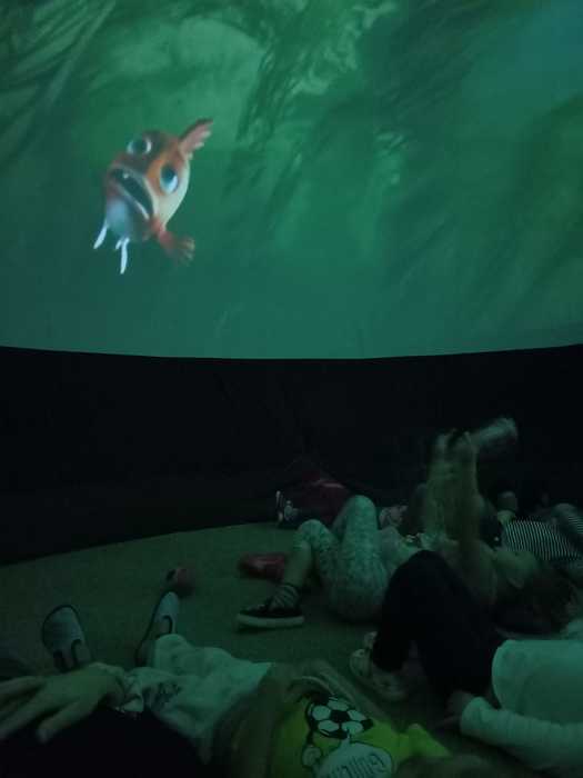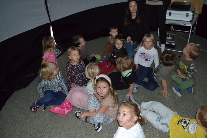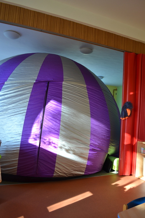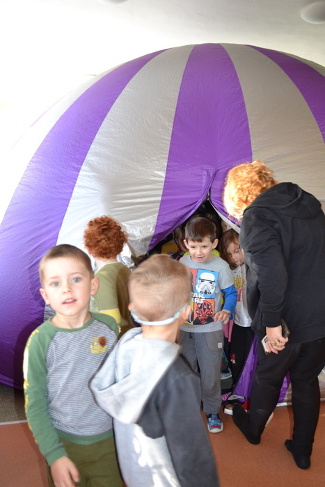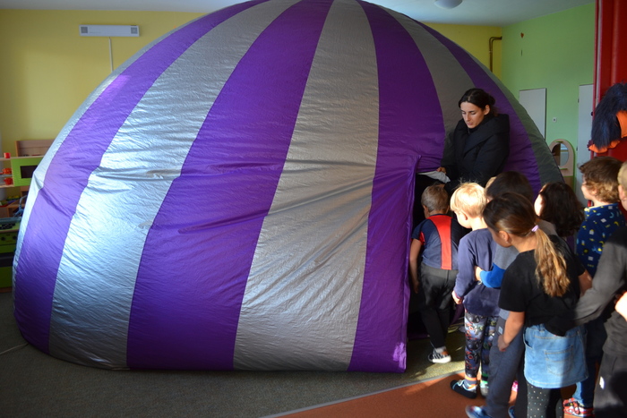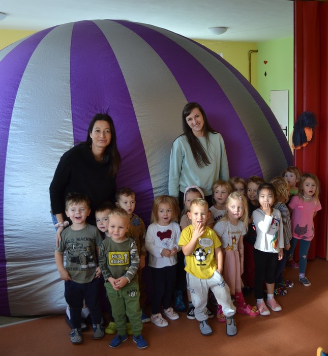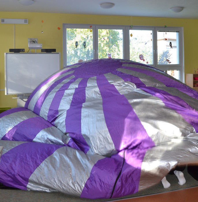Dneska jsme málem odletěli balónem. Ve třídě to totiž chvilku vypadalo, že se tu jeden krásný fialovo bílý balón nafukuje. Ale ono né. Když už nám málem rozbořil třídu, tak se přestal nafukovat, objevily se do vnitřku balónu dveře a my mohli vstoupit. A hle, není to balón, je to kino. Kino, ve kterém můžete polehávat po zemi a příběh se vám děje nad hlavou. Kočičky se ocitly s malou kamarádkou Miou u jejího moudrého dědečka, který znal mnohá tajemství vesmíru a života na zemi. Měl krásný model sluneční soustavy a uměl o ní zajímavě povídat. A také už díky němu víme, proč se zeměkoule točí našišato. Kdyby nebyla nakloněná, nemohla by se střídat roční období.