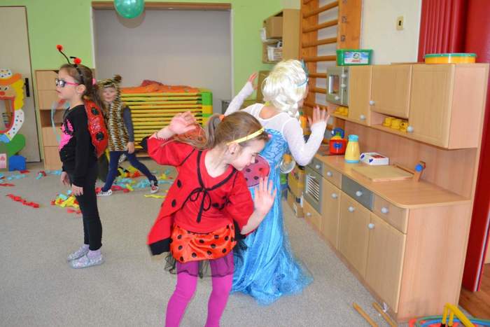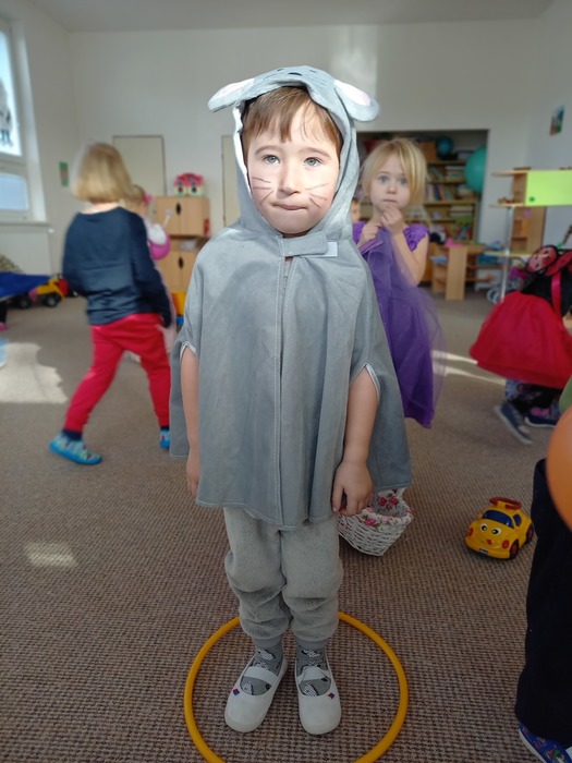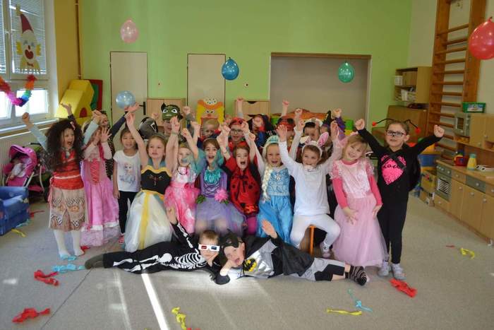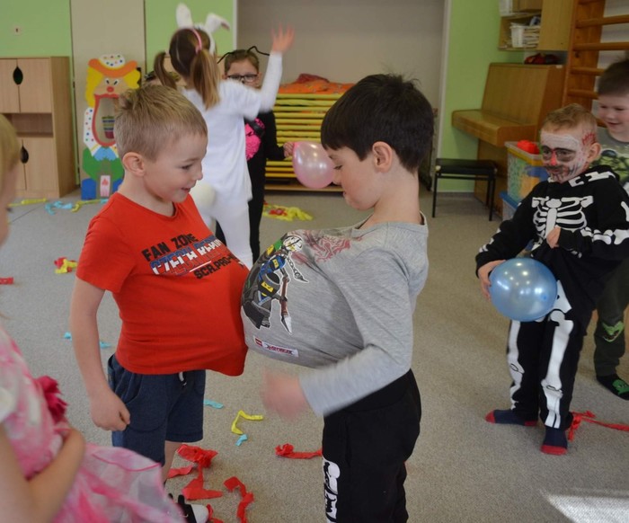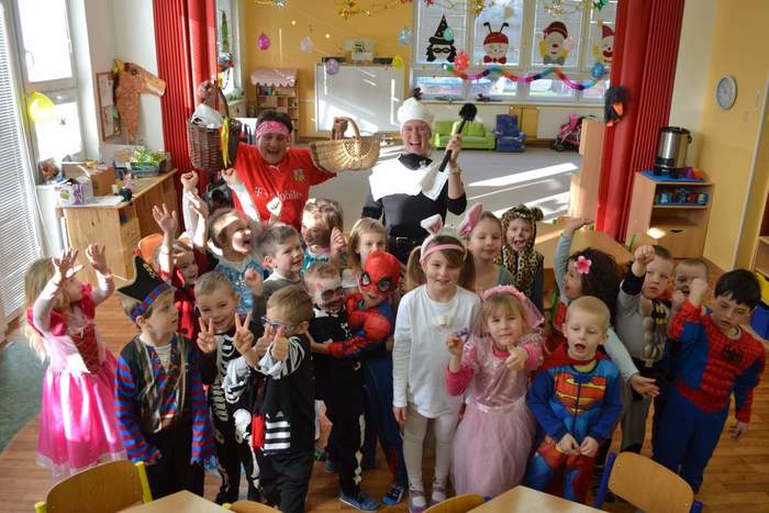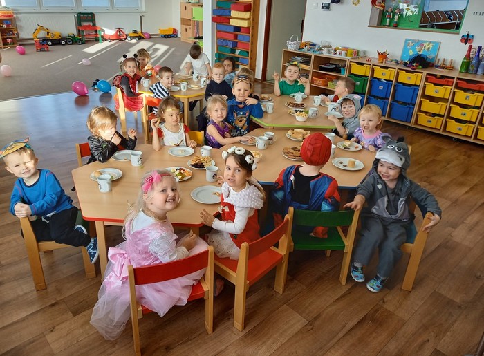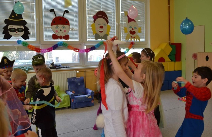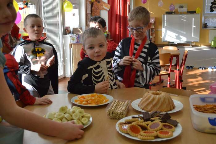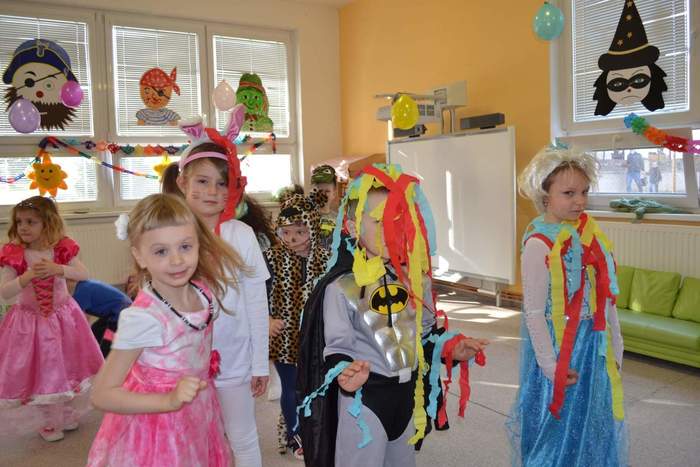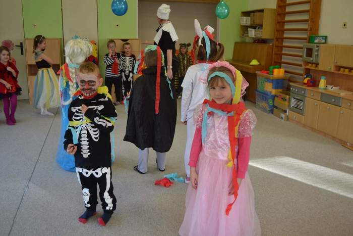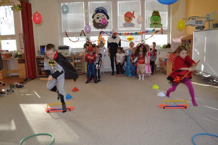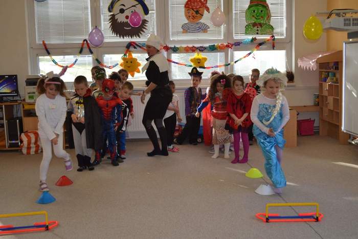 Aniž bychom tušili, že si vlastně užíváme večírek (či vlastně dopoledníček) na rozloučenou, tak jsme pojali čtvrteční dopoledne vesele, dalo by se říci, že až rozpustile. Jak taky jinak, než rozpustile se chovají všelijaké pohádkové, či dokonce nesmyslné bytosti. I když vlastně princeznám, batmanům, kostlivcům a dalším netvorům by asi kousíček důstojnosti slušel. U nás ne, u nás se řádilo. Pravda, občas se při přeskakování překážek zamotávala vlečka do urozených nožiček, překážel leopardí ocásek a zaječím ouškům se sem tam podařilo upadnout. Zato nadpřirozené schopnosti betmenů, spajdrmenů a ostatních menů, které ani neznám, dovolovaly v letu konkurovat třeba i beruščím křídlům. Vesele barevná podívaná. A když už se řáděním zadýchal dokonce i námořník s policajtem, tak se u stolků s dobrotami ve shodě nabaštili a napojili dohromady s oslíkem, myškou, princeznami a všemi ostatními. Tentokrát podivným bytostem maminky nemohly napéct dobroty, ale i z koupených laskomin se dají pořádně napráskat pupky, jen kostlivcům sušenky propadávaly mezi žebry. Všem za přinesené ovoce a další pochutiny děkujeme a věříme, že si další akci snad užijeme v dohledné době.