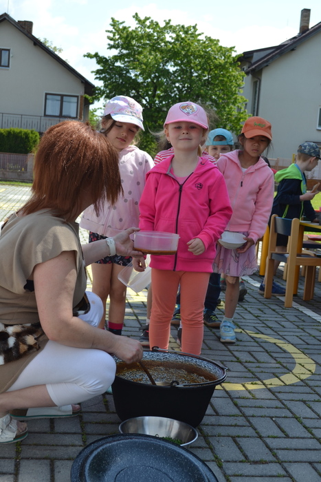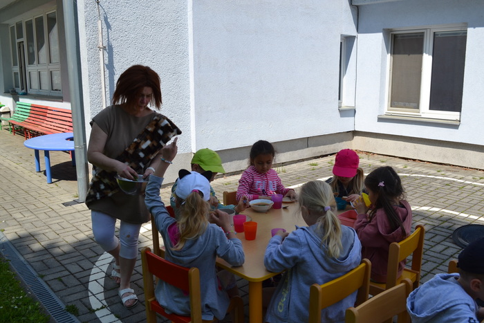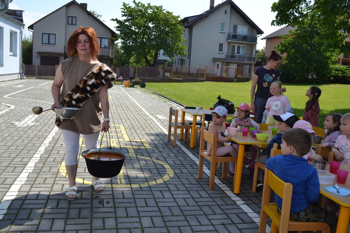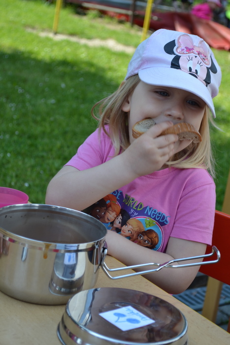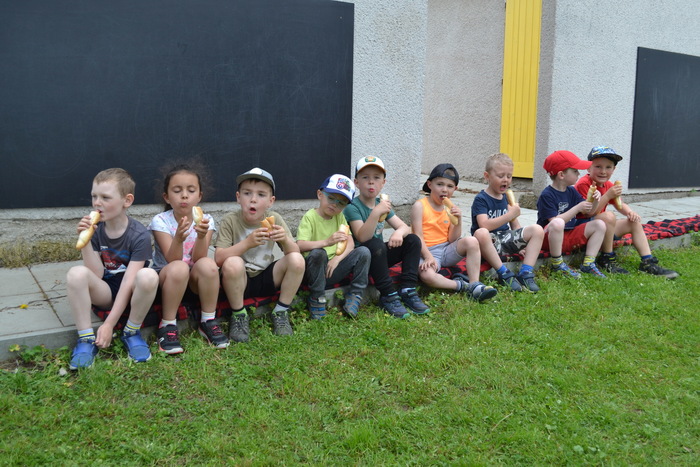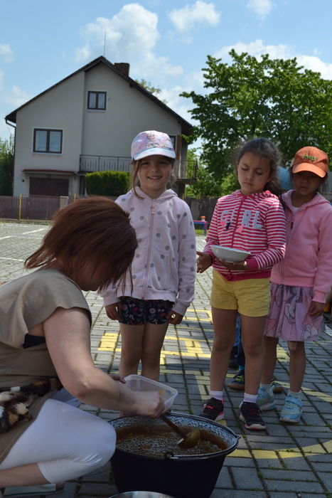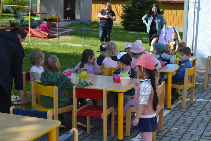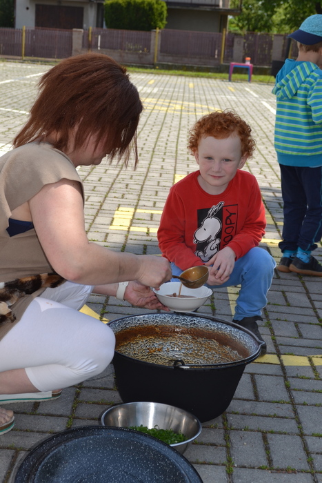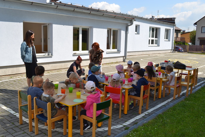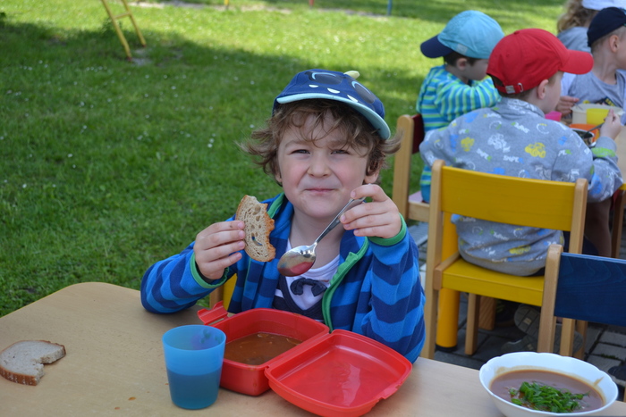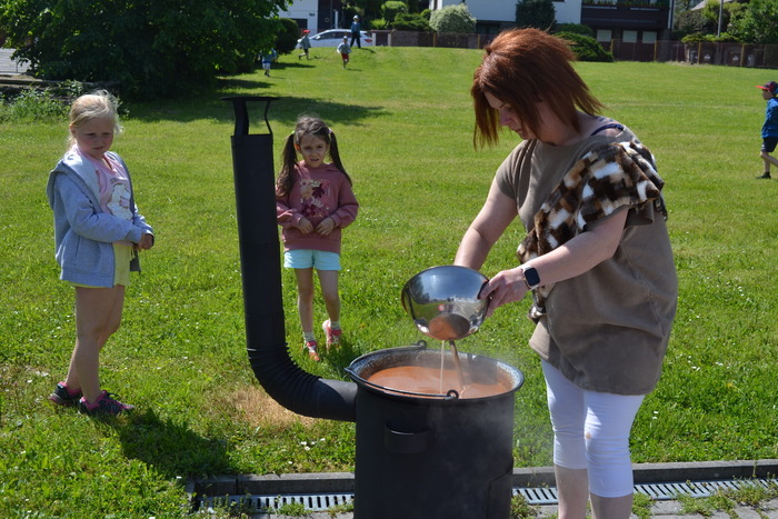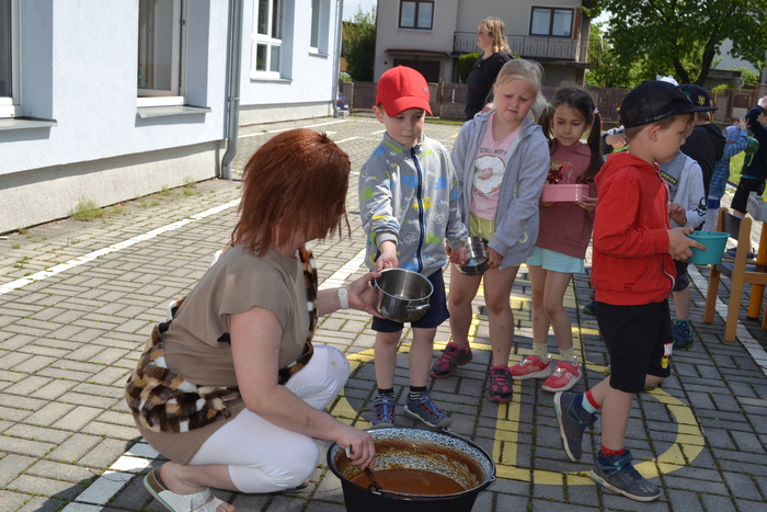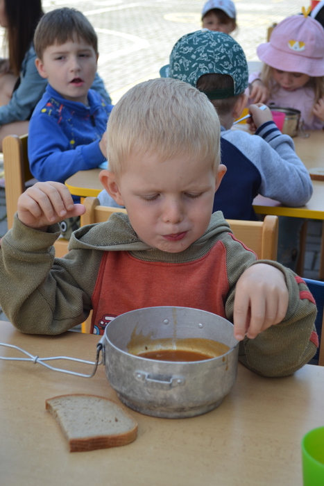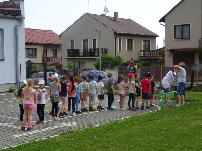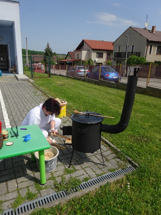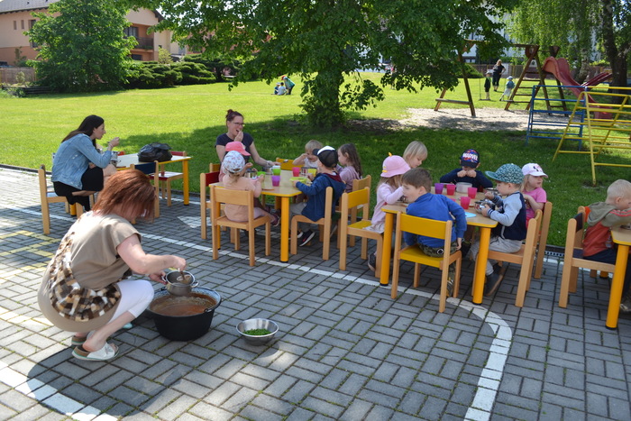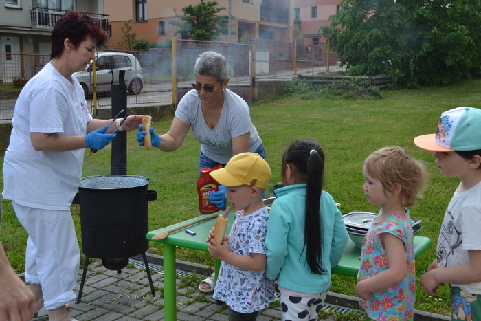 Novodobí lidé, kteří nám do školky posílají po kabelech elektřinu, aby mohla paní kuchařka vařit, asi zjistili, o čem si tento týden povídáme a ukázali nám, jak to bez elektrických přístrojů funguje. Prostě nám ji na dva dny vypli. No, nefunguje. Na prosbu, aby paní učitelka vytiskla obrázek, se jen usmála a řekla, že to nejde. Prosba o teplou vodu vyšla na stejně. Prostě jsme se myly ve studené. Brr. A nejhůř bylo v kuchyni. Ať točila teta kuchařka Zuzka knoflíky sem tam, plotna pořád zůstávala studená. Ale že je teta kuchařka Zuzka koumák, tak v úterý sehnala dřevo, roztopila v kotlíku a ohřála nám párky. Párky v rohlíku. Tak to byl skvělý oběd! A sotva jsme dojedly párky a dopatlaly kečup po tričkách, tak se přihnala bouřka. Asi chtěla tetě kuchařce pomoci s ohněm. Teď bylo na čase rychle doběhnout do jeskyně……. vlastně do školky.