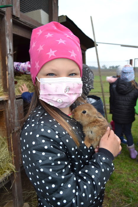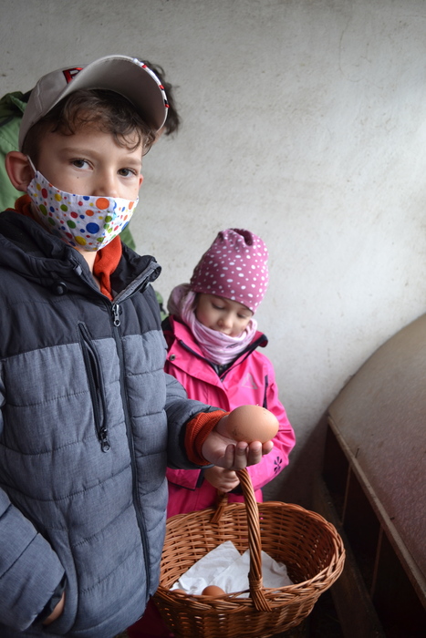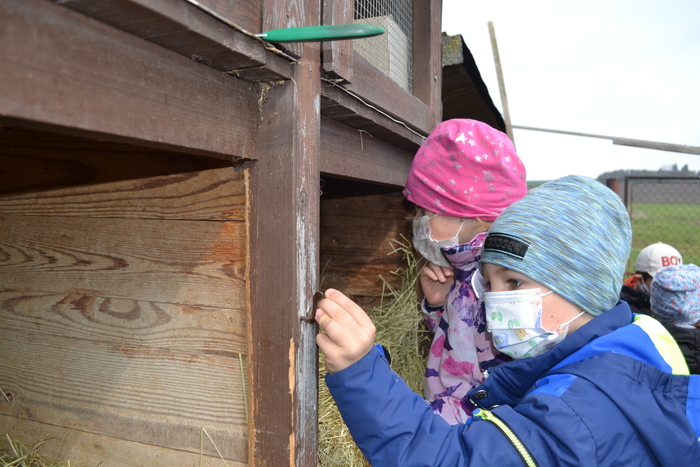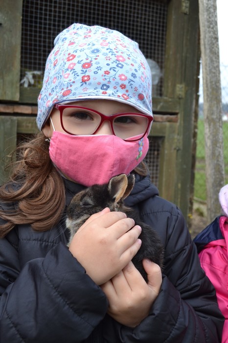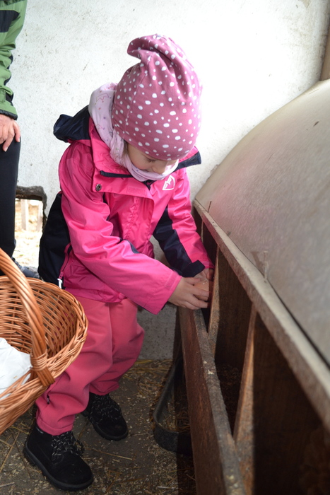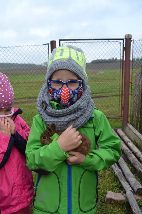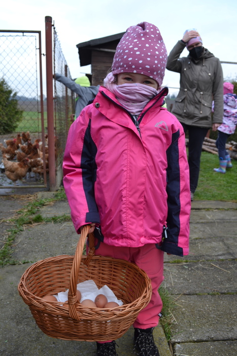 Na jaře se rodí mláďátka. Tak to už my, předškoláci, dávno víme. A dokonce známe jejich názvy. Kravičce se narodí telátko, ovečce jehňátko…. a králíčkovi…..? Jak se jmenuje mláďátko od králičí maminky? Dohodli jsme se, že králíček. A právě na malé králíčky jsme se šli podívat k tetě Marcele. Mohli jsme si je pohladit, pochovat a teta nám o nich pěkně vyprávěla. Kohout se opodál naparoval v plné kráse a brousil si ostruhy. Co jsou ostruhy už taky víme a dáme si na ně pořádný pozor. Také jsme se dozvěděli, proč mají slepice na nožičkách barevné náramky – kroužky se jim říká. Pomohli jsme tetě králíčky i slepičky nakrmit, a dokonce jsme v kurníku sebrali do košíčku vejce. Za tuhle důležitou práci nás ve školce čekala odměna v podobě palačinek. Užili jsme si pěkný jarní den.