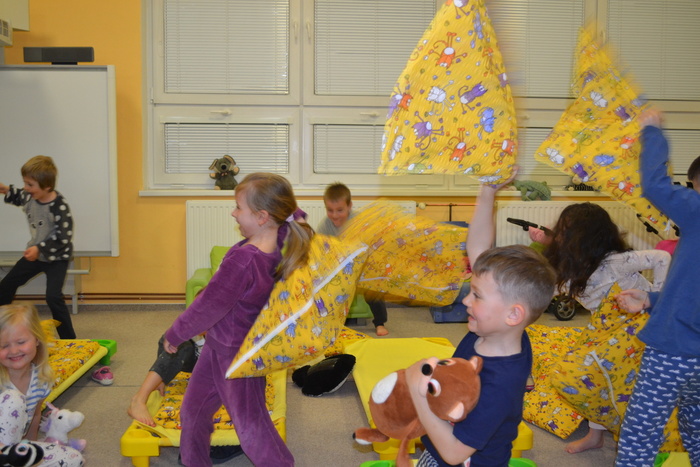 Během plavby nám vyhládlo a rádi jsme zasedli k těstovinovému salátu, který nám připravila teta kuchařka. A pak přišlo to, na co jsme se od rána těšili. Ano, diskotéka a polštářová bitva musí být! A že nás bavila. A unavila. Takže: Pššš, právě usínáme u čtení pohádek.