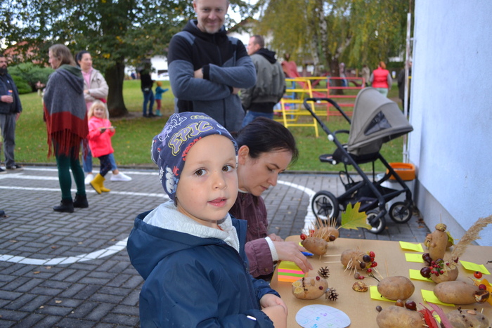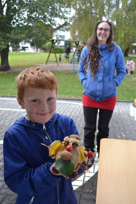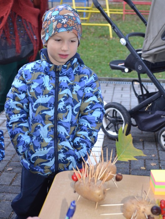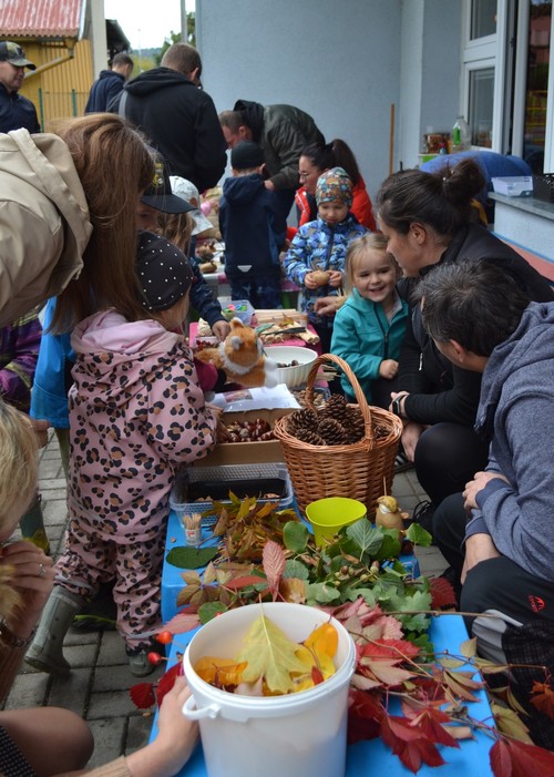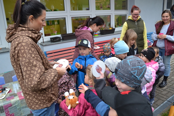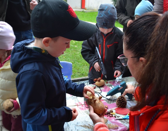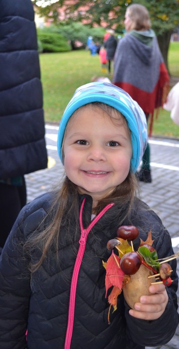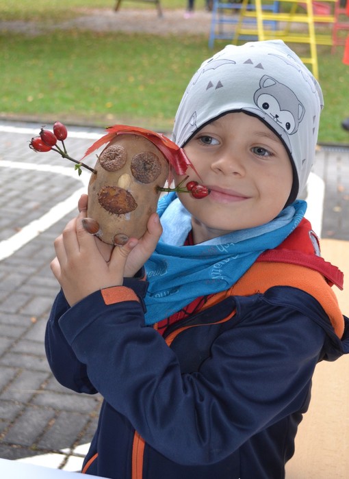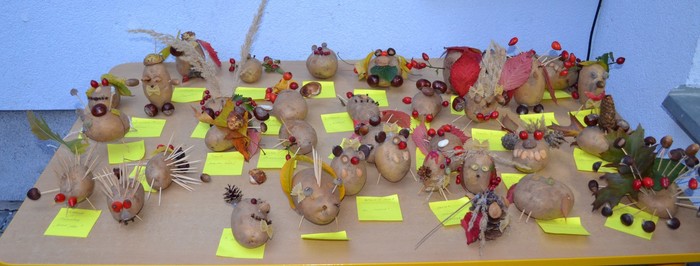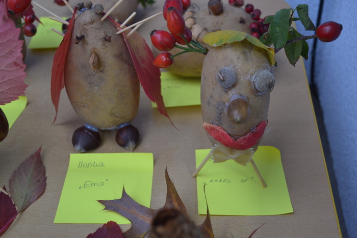 Ve čtvrtek dopoledne se přihnal vítr přímo ukrutný a oznámil nám, že je tu podzim se vším všudy. Třeba s pouštěním draků, nebo sklízením podzimních plodů. Pouštění draků necháme na jindy, ale s podzimními plody jsme si odpoledne vyhrály. Vybaveny kartičkami na razítka jsme se vydaly po naší zahradě vyhledat podzimní otázky. Na cestě nás doprovázeli rodiče a po společném vyluštění odpovědí a vyplnění kartičky nám dala paní učitelka bramboru. Protože brambora, to je královna podzimních plodů přímo lákající k hrátkám. Třeba z ní vytvořit skřítka podzimníčka. K tomu nám pomohly další podzimní skvosty přírody. Vesele barevné listy, rudé plody hlohu a mnoho dalších. Tvoření nás bavilo. Svého skřítka jsme si pojmenovaly a za chvíli se k sobě tulili Veselí ježci s Karlem IV. Přidali se Žabák s Bambulákem a Žaluďákem. A spousty dalších. Skřítků se nám urodilo.
