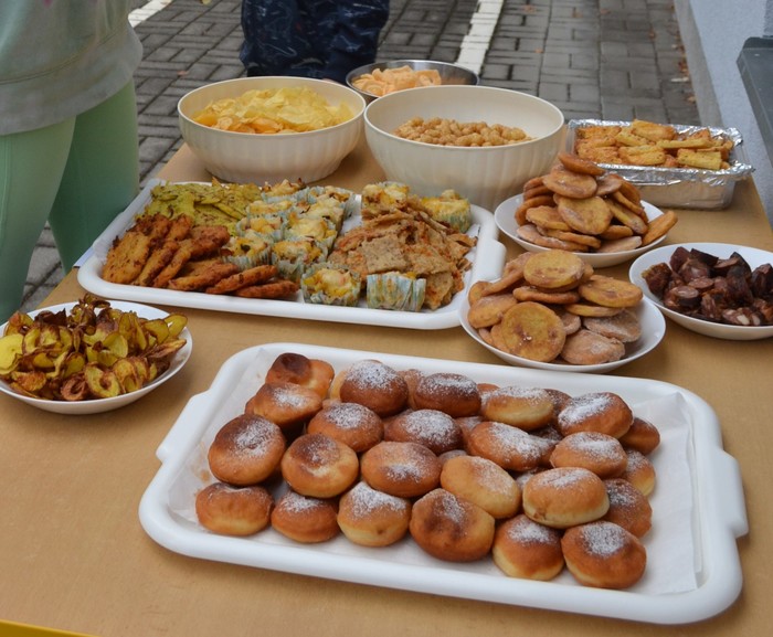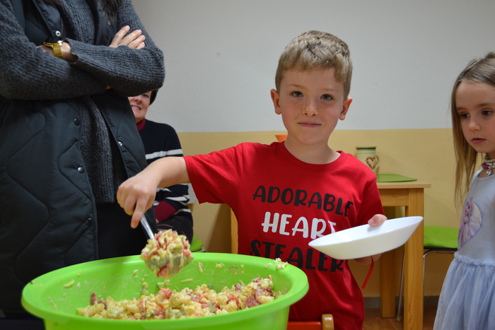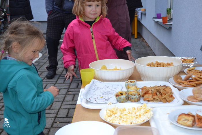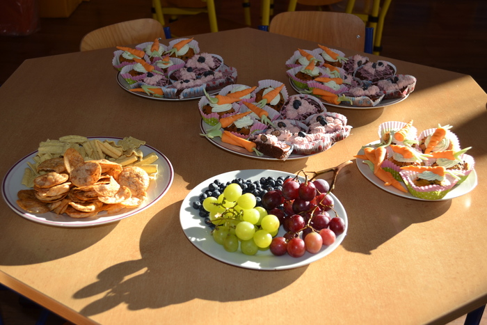 Poté přišel čas k navštívení stolu plného dobrot. Naše maminky to s bramborami umí nejen při tvoření, ale i v kuchyni. A tak jsme mohly ochutnat placky na slano i na sladko, bramborové mufiny, vřetena, tyčinky, a dokonce i koblížky. K tomu ještě spoustu dalších dobrot, za které moc děkujeme. Vše jsme to zapíjely teplým ovocným a mátovým čajem, protože k podzimnímu počasí čaj patří zrovna tak jako hrátky. A ty jsme si tedy užily.