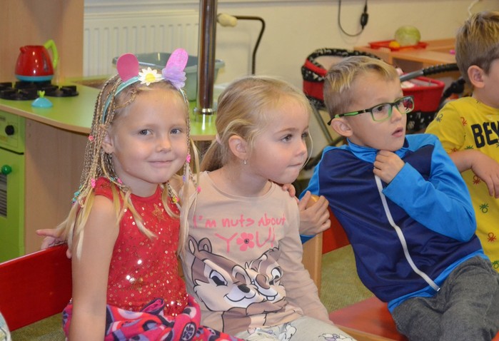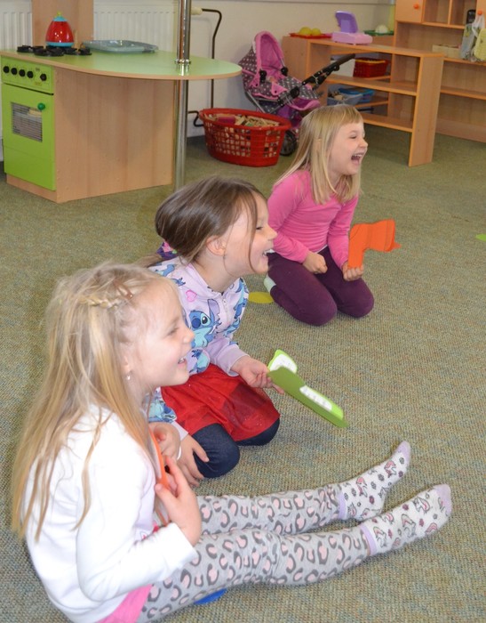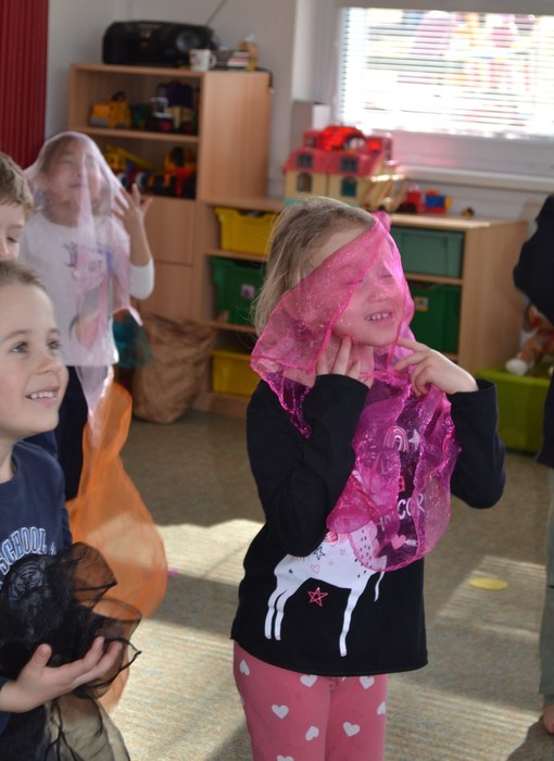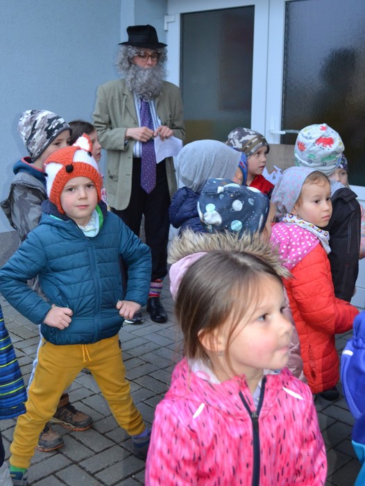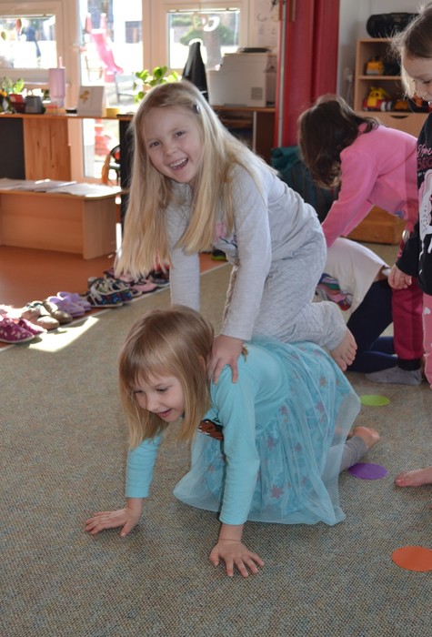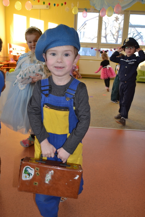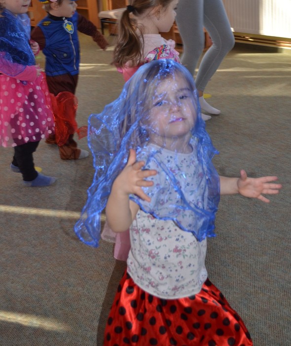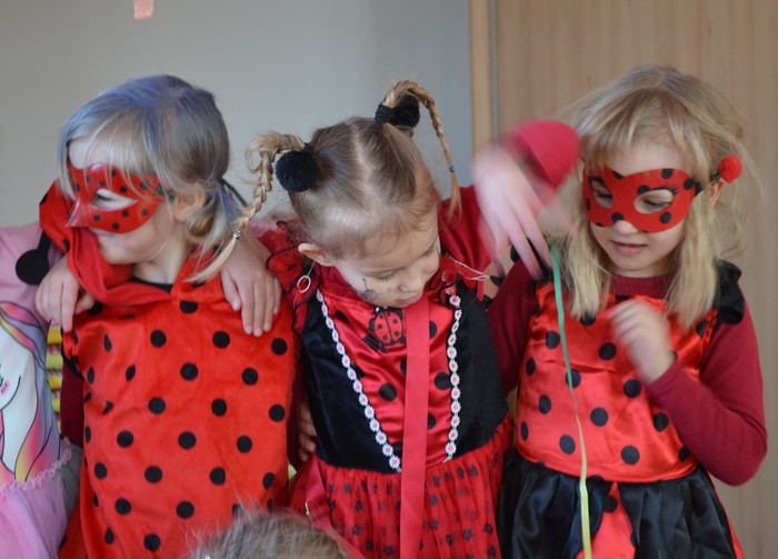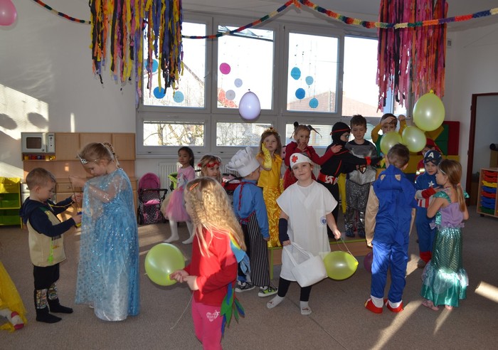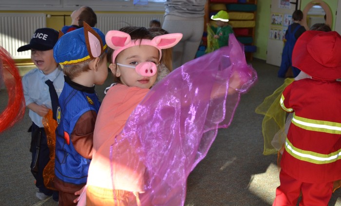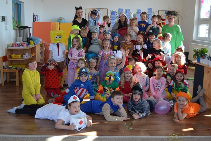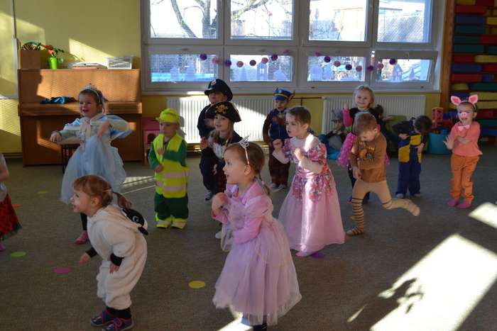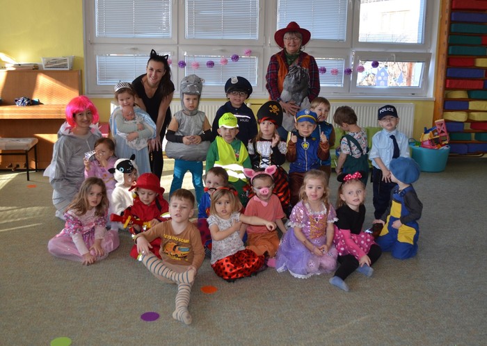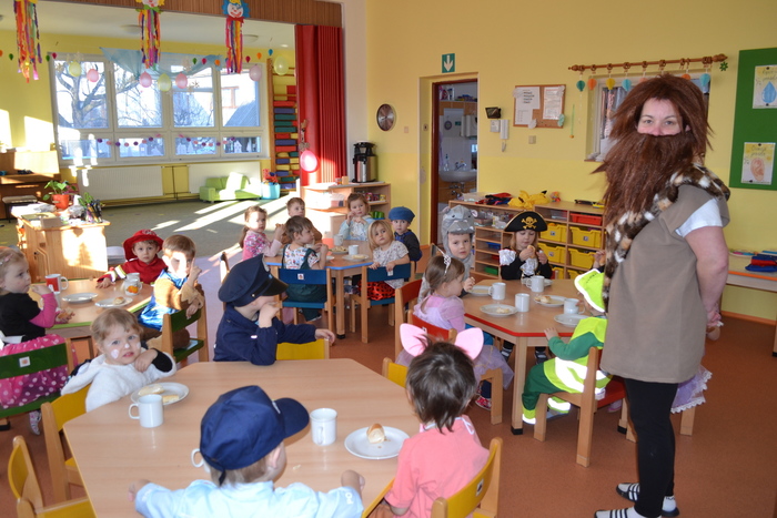 Víte, jak to vypadá, když si spolu hrají pirát s popelářem? Když žralok chová ovečku a tančí spolu policista s mořskou pannou? My ano. Přesně to, a ještě spoustu jiných podivností, se dnes u nás událo. Prostě se rejdilo. Rejdili papoušci, berušky, kočičky, princezny, dokonce se přidal i keř s ptačím hnízdem, Spongebob, Superman, zdravotní sestřička, hasič, rytíř … a věřte nevěřte, přidal se i hroch a dokonce mrkev. Mrkev měla chvilkami obavy, neb jí pronásledoval kůň, a i pan kuchař po ní pokukoval. Mrkev nakonec přežila, ale odpoledne nás prý čeká mrkvová pomazánka, tak uvidíme. Celé to rojení bylo veselé, proložené různým hraním a baštěním. Za všechny dobroty na maškarní stůl moc děkujeme.