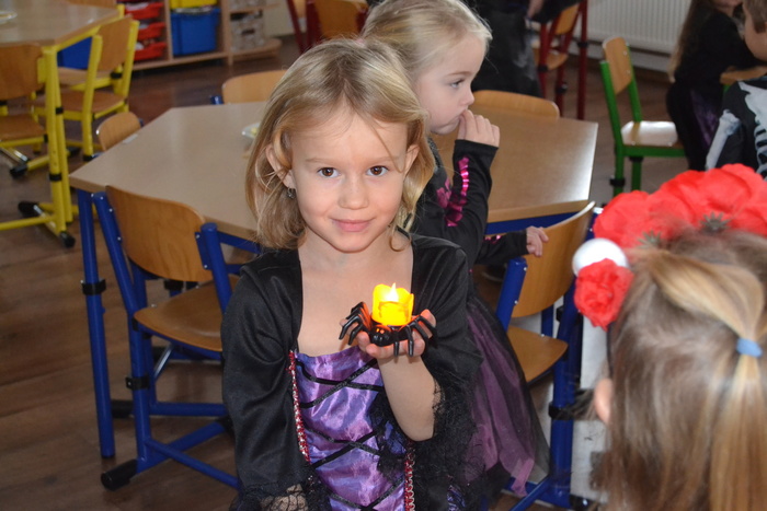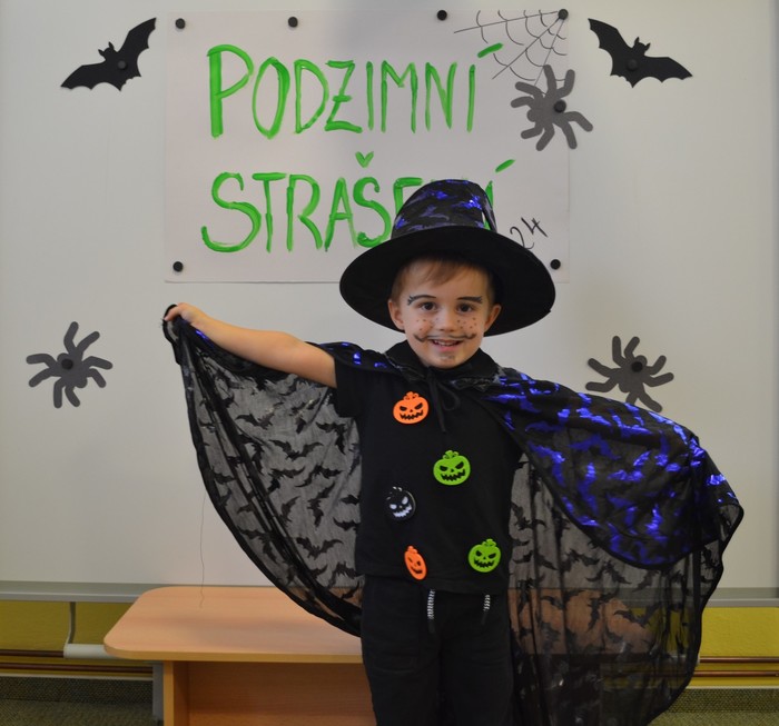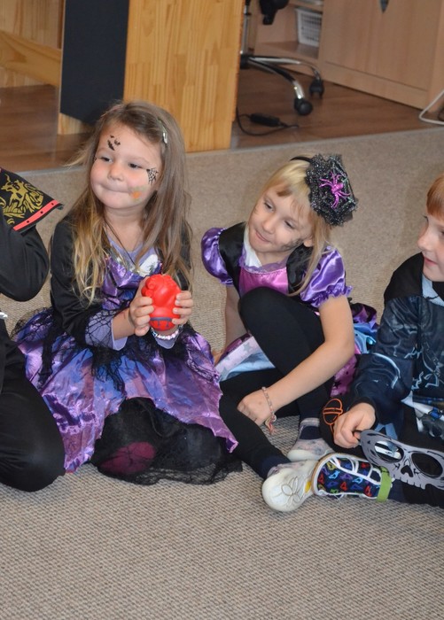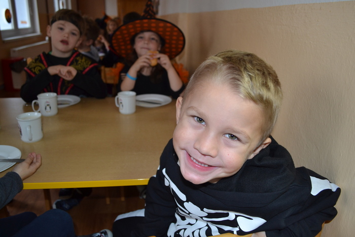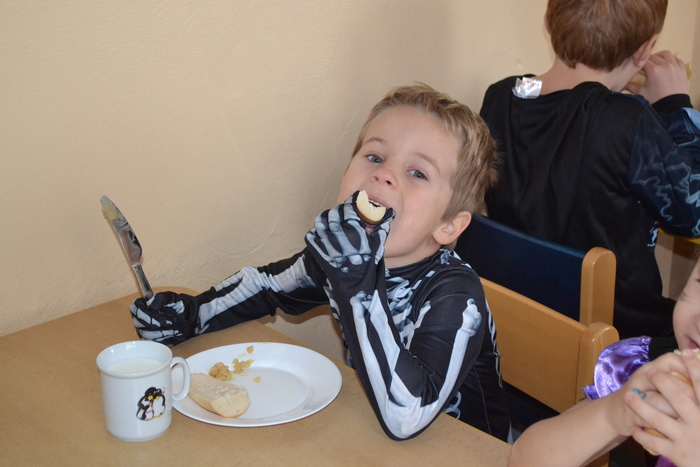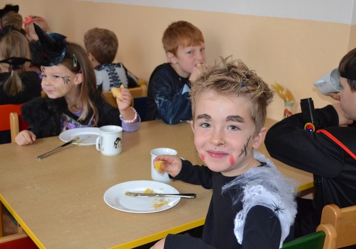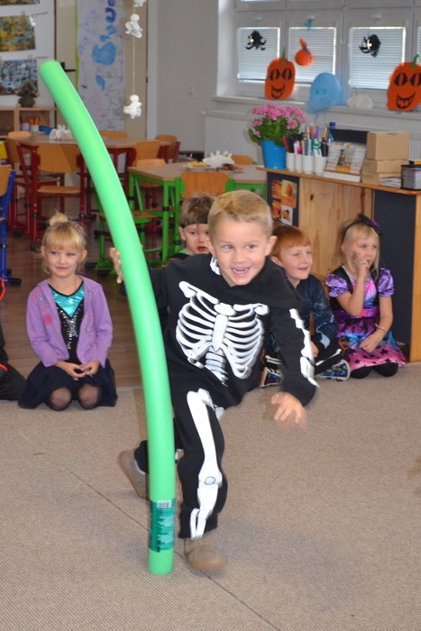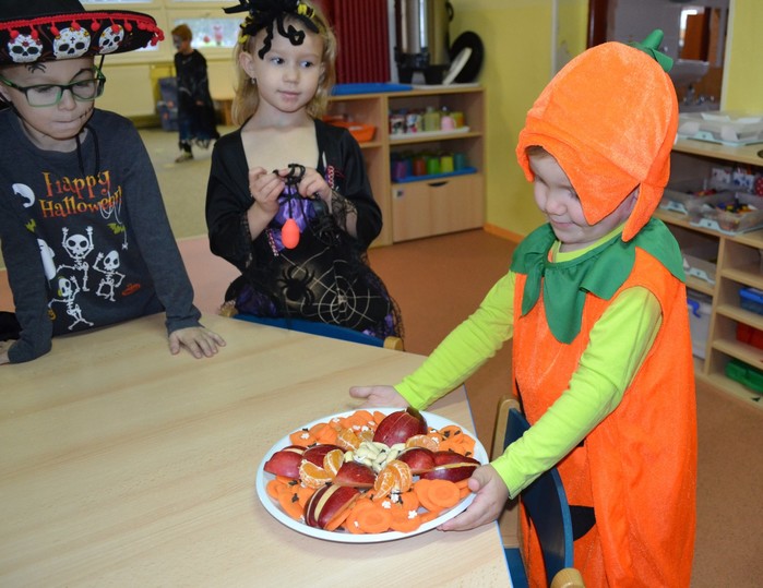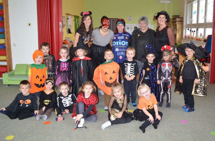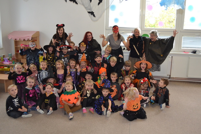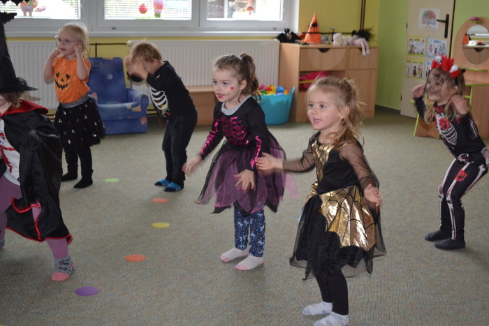 Podzimní dny přinesly čas svíček, návštěv hřbitovů a vzpomínek na naše blízké, kteří už s námi nejsou. Právě o tom jsme si dneska povídaly. A protože ani oni blízcí by si určitě nepřáli, abychom moc smutnily, tak se naše povídání pomalu změnilo v dovádění, hraní a tančení. Tu spolu soutěžil kostlivec s čarodějem, tu tančila kouzelnice s dýní a do toho poletovali netopýři a pavouci. Kdejaká havěť se přátelila s upíry a společně se vrhli i k tabulím na nichž nás lákaly dobroty v podobě duchů, pavučin, košťat a všeho možného. Za to vše moc děkujeme maminkám i babičkám. Prožily jsme veselý den.