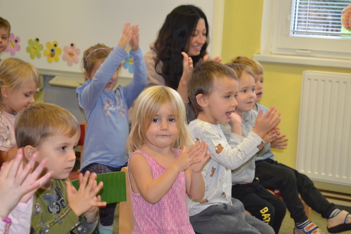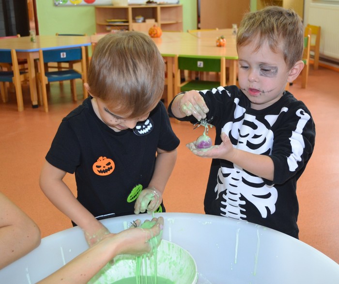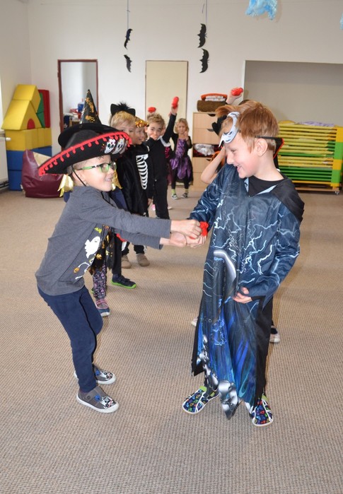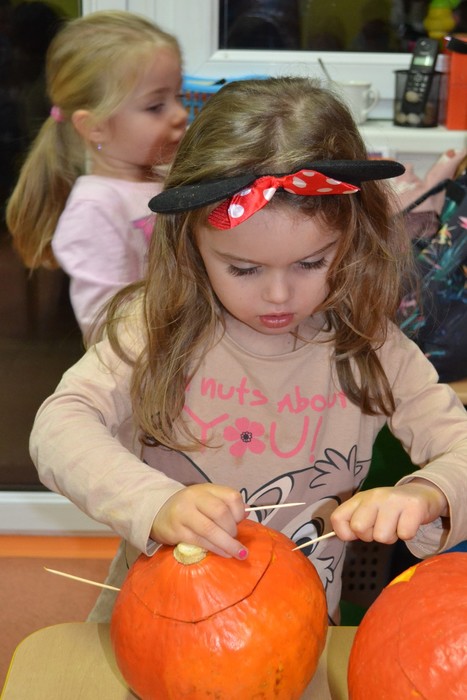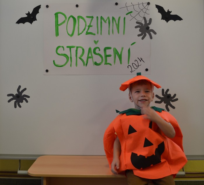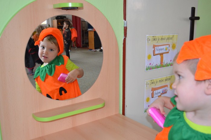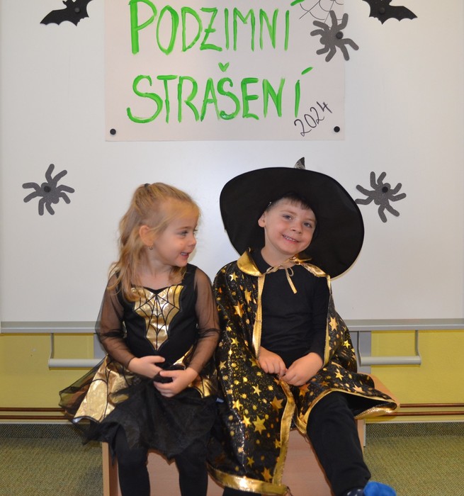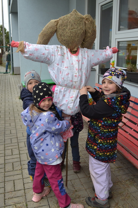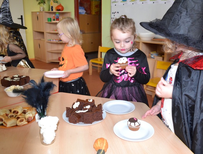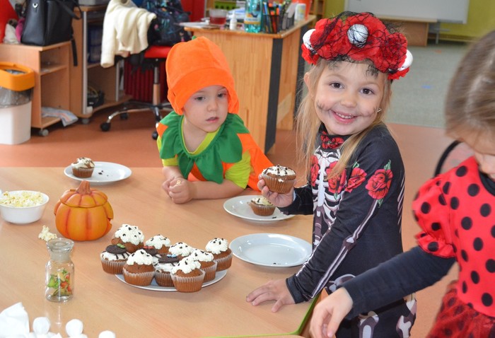 Podzimní dny přinesly čas svíček, návštěv hřbitovů a vzpomínek na naše blízké, kteří už s námi nejsou. Právě o tom jsme si dneska povídaly. A protože ani oni blízcí by si určitě nepřáli, abychom moc smutnily, tak se naše povídání pomalu změnilo v dovádění, hraní a tančení. Tu spolu soutěžil kostlivec s čarodějem, tu tančila kouzelnice s dýní a do toho poletovali netopýři a pavouci. Kdejaká havěť se přátelila s upíry a společně se vrhli i k tabulím na nichž nás lákaly dobroty v podobě duchů, pavučin, košťat a všeho možného. Za to vše moc děkujeme maminkám i babičkám. Prožily jsme veselý den.