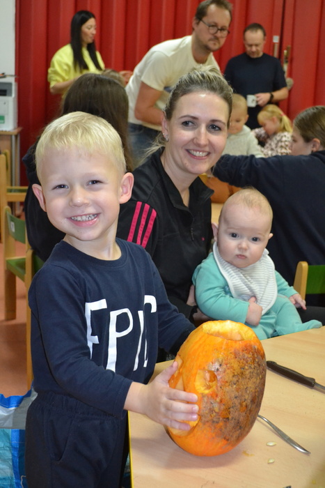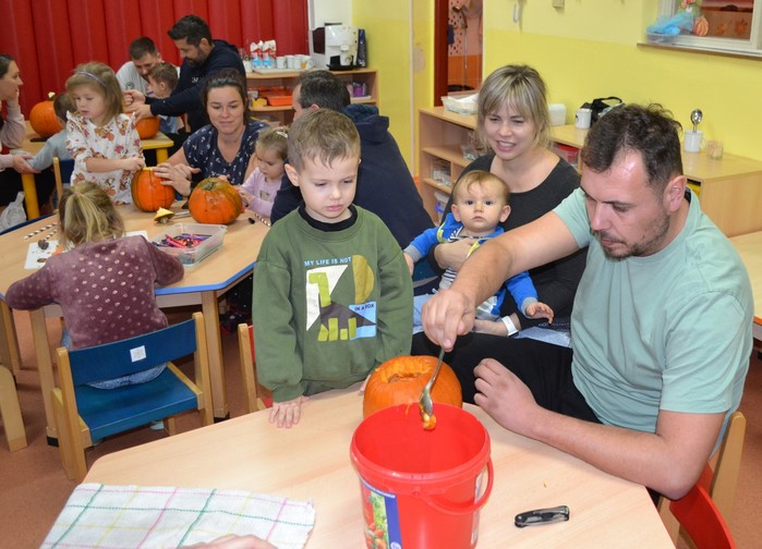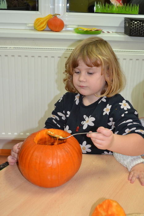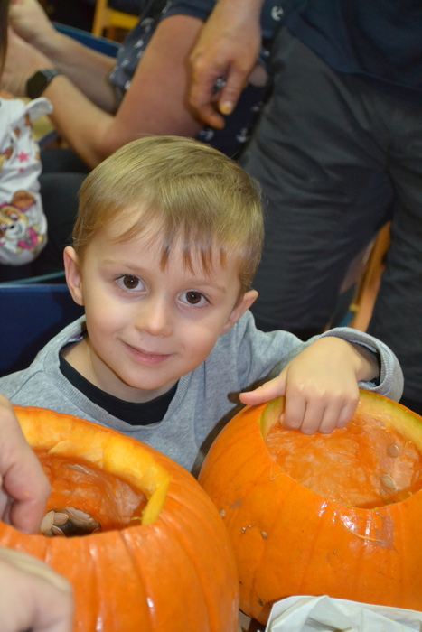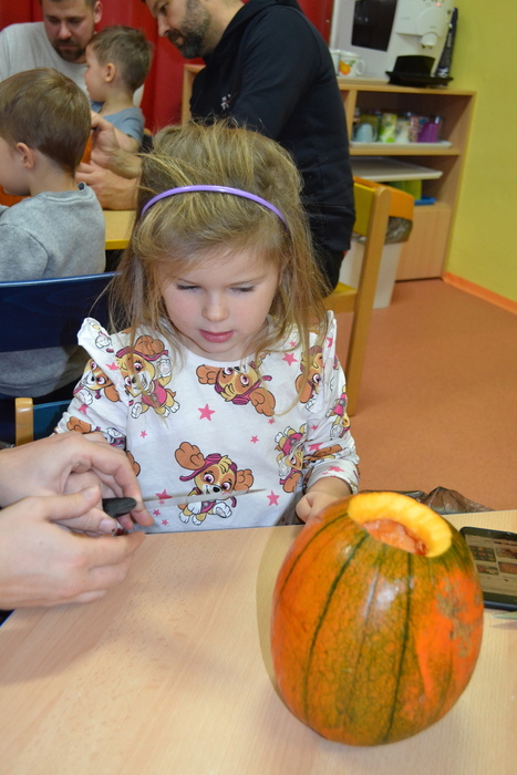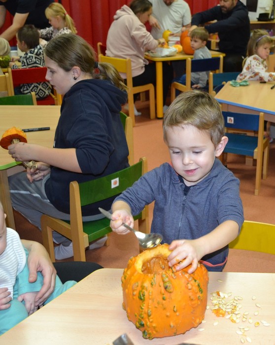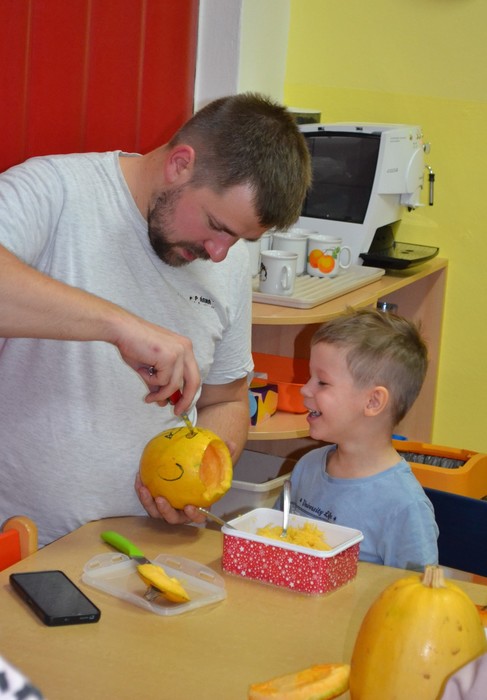 Středečnímu odpoledni u Sluníček vládla oranžová barva. Barva patřící podzimu a dýním. Dýně se ujaly hlavní role naší sešlosti s dětmi a rodiči. Dýně tvářící se vesele, drsně, rozpustile, potměšile či hrozivě. To, jak se dle přání malých Sluníček podařilo rodičům dýně vyřezat. V některých případech se nože ujalo i samo šikovné Sluníčko. Odpoledne jsme si dohromady krásně užili. K dobré náladě přispěly i rohlíčky, našimi Sluníčky pečené. Večerní přehlídka dýňových rozsvícených tváří měla tu správnou atmosféru a dětské tváře se rozzářily úplně stejně. A o to přeci jde. Díky vám, kteří jste přišli a o tu záři se zasloužili.