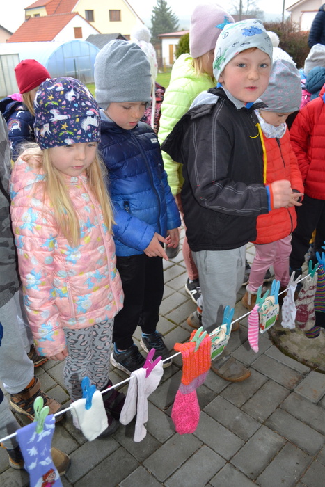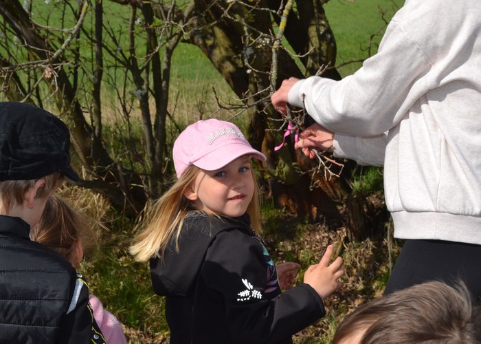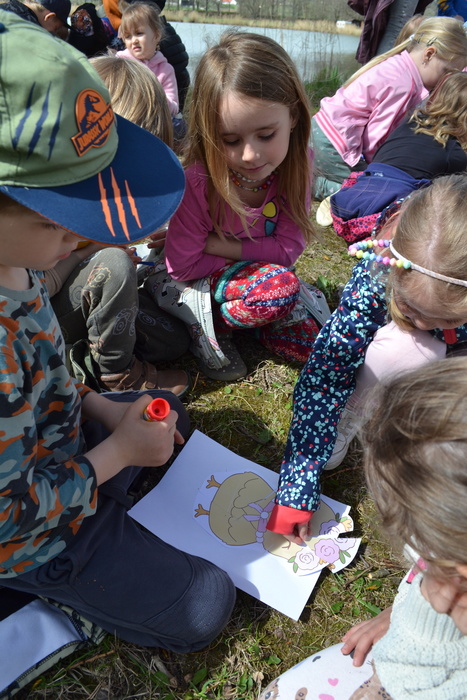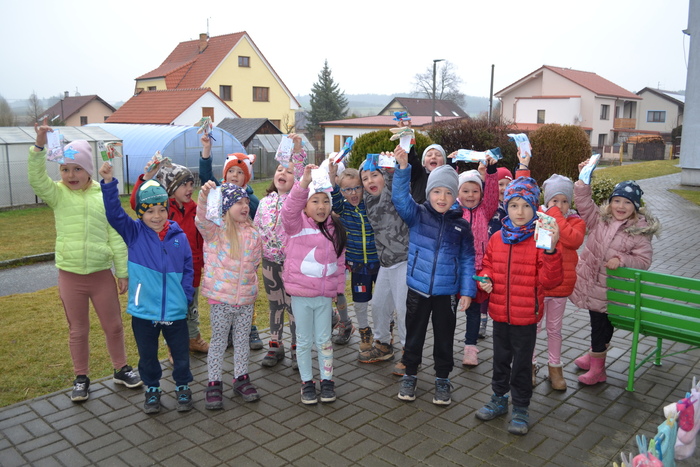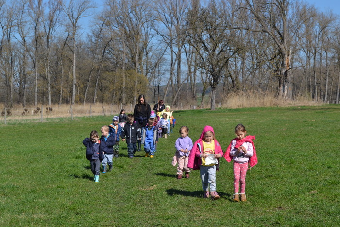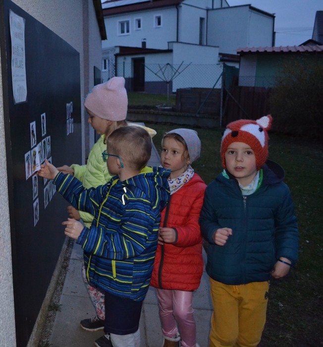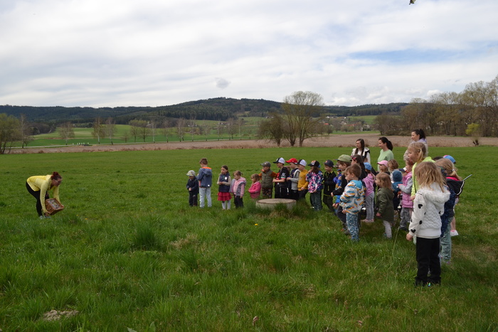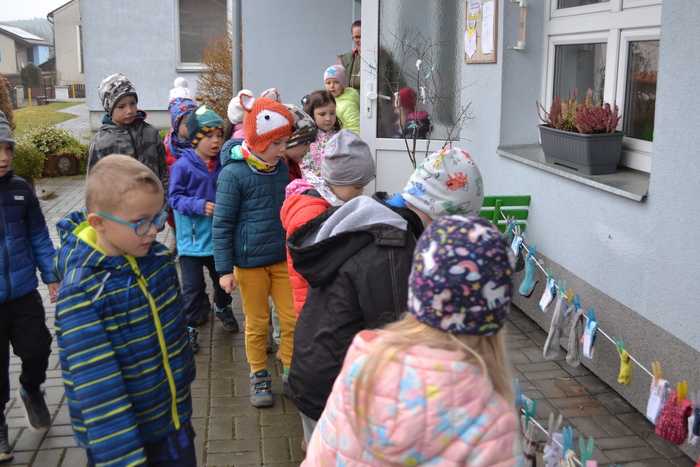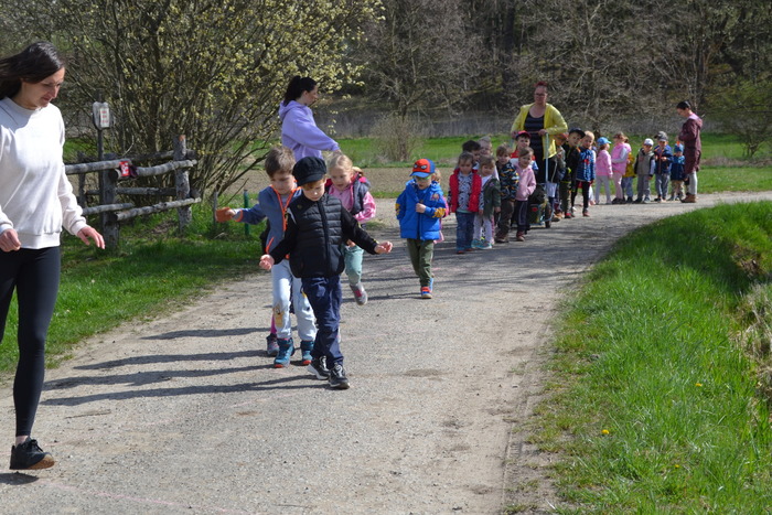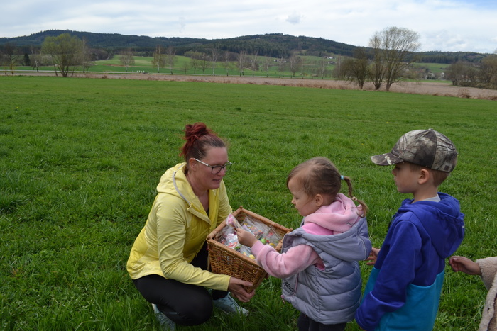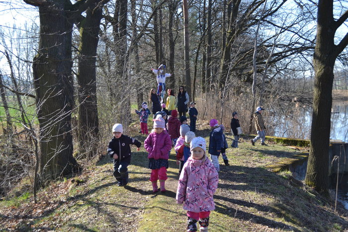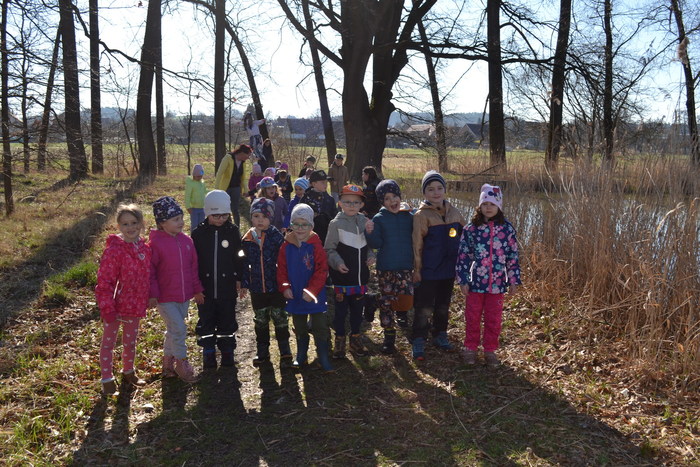 Prý tudy běžel zajíček a měl zádech nůši! Povídala paní učitelka Lucka, když nás konečně na naší procházce doběhla. To znamená, že jdeme dobrým směrem. Potvrzují to i mašle uvázané na jarně zelených větvičkách. Každý z nás si jednu mašli najdeme, prý ji budeme na konci cesty potřebovat. Zajíčková cesta nás vede lesem, kolem farmy s koněm, mezi loukami, rozkvetlými stromy a po hrázi rybníka. Občas nás zastaví rozcestí s dvojí barvou šipek. Po které se dát? To nám napoví úkol na barevném vajíčku. Po jeho splnění zjistíme, kterou cestou se vydat vstříc dalším úkolům a snad i nějakému překvapení. A tak jsme plnily úkoly. Třeba sestavit obří kraslici z přírodnin. Projít, proskákat a proběhnout vyznačenou trasu. Vyluštit velikonoční křížovku, sestavit puzzle … Vše se nám podařilo a vajíčka nás tím dovedla až ke žlutě rozkvetlému keři. Ten se líbil asi i zajíčkovi, protože přesně pod ním, hned vedle narcisek, nechal nůši s odměnou. A teď honem do školky, už tam na nás čeká velikonoční oběd, a dokonce i někteří rodiče. Pooběďáckým rodičům se omlouváme za zpoždění, ale to víte, někdy se nám ta zážitková cesta prostě protáhne :-). A ještě: ,,Jak se říká velikonočnímu vajíčku?“ ,,Já vím! Velikonoční vajíčko!“ A také už víme, že Vánoce vánoce přicházejí… není ta správná velikonoční koleda.