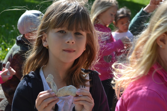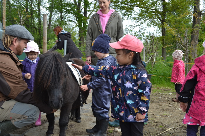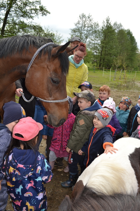 Mohly jsme si pohladit hebounké králíčky, narozené zrovna na Velikonoce, poslechly jsme si, jak se o ně Štěpánek s maminkou starají, aby jim bylo dobře a pak jsme moc rády přivítaly poníky, kteří k nám přicházeli z ohrady. Flekatá Zlatuška si očichala pár nových kamarádů a dovolila jim, aby jí povodili po šťavnaté travičce. To tmavý Sírius měl práce víc a ujal se jí s hlavou hrdě vztyčenou. Dovolil nám, abychom se podívaly na svět z jeho hřbetu. Moc nás to bavilo a někteří z nás asi doma nutně potřebujeme poníka. Povozit celou třídu Sluníček je docela nápor, a tak Síriovi poděkujeme, podrbeme ho po hlavě a jdeme se podívat do další ohrady za potůček.