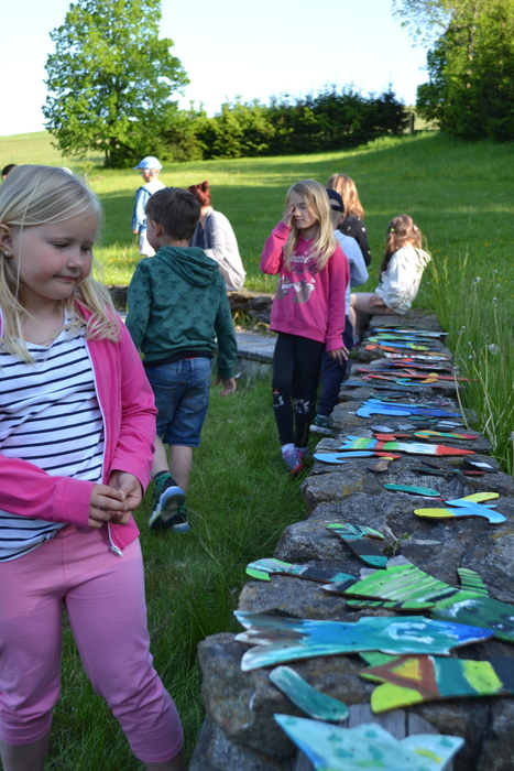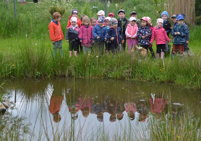 Když už jsme si dostatečně obalily gumovky v blátě a Kery zastříhal ušima na pozdrav, tak se vydáváme po můstku k rybníčku s lekníny a zlatými rybkami. Dostáváme ponaučení, jak se chovat, abychom nějakou tu ploutvičku zahlédly a můžeme rybičky nakrmit. Za odměnu vymalují kruhové obrazce na hladině a ukáží nám našpulené čumáčky. Štěpánkův tatínek rybičkám říká červené Karkulky, jako v pohádce.