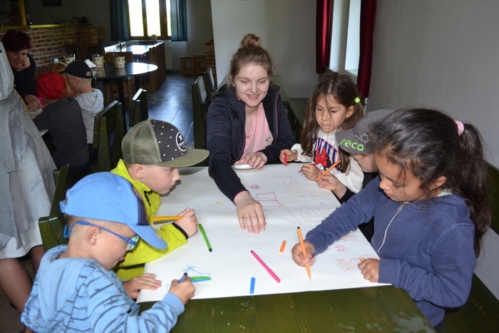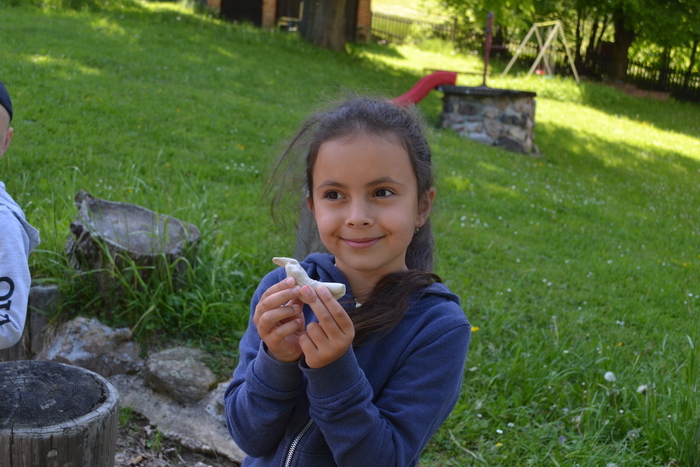 Jakmile nás dospělačky nastříkaly ,,lerepentem“, tak dorazila Červená Karkulka a mohly jsme vyrazit na lov dalších rekvizit do pohádek. Karkulka nás vedla krásnou cestou přes malebný Hořejší Těšov a na místě s úchvatným výhledem do dálky jsme opět plnily úkoly. Nejprve úkoly, které nám přikázaly rybičky. Nejzajímavější úkolovou rybičku si vytáhl Matýsek, který si jediný nesundal ze zad batůžek. ,,Prolez celé skupině pod nohama“- docela legranda. Taky nás trochu rozesmála odpověď na otázku, jakouže známe jedovatou rostlinu na „P“ : ,,Péťa“. Kromě úkolů jsme si vychytaly i rekvizity do pohádek a mohly jsme si dát pauzu na svačinku, kterou nám skvěle připravil pan domácí.