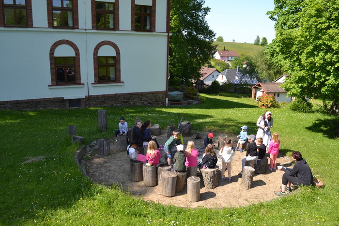 Na velikém kopci stojí stará, ale krásně opravená budova. Prý tu bývala škola. A teď nás moc překvapil Péťa. Říkal, že do této školy chodil jeho děda, který v Těšově jako kluk bydlel. To jsou ale náhody, co?