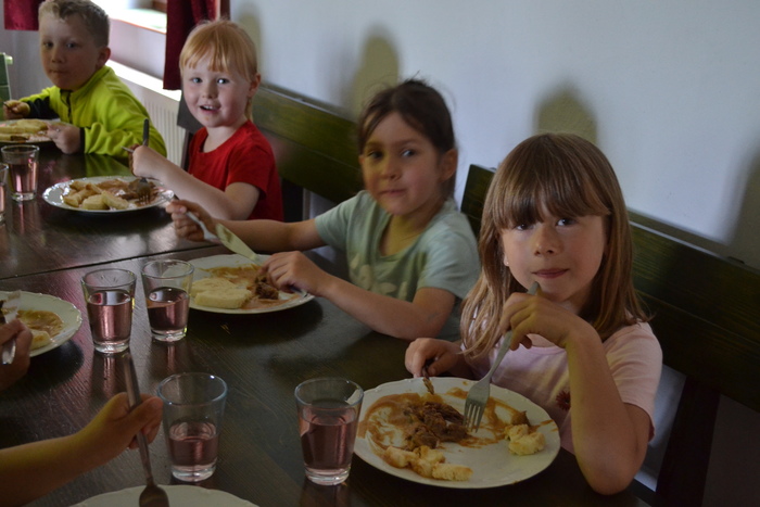 Rozprskly jsme se do pokojů a už se nám v jídelně chystalo jídlo. Na uvítanou kuře na paprice. Paní kuchařka stihla hned při prvním jídle zjistit, že si na nás bude muset pořídit větší hrnce.