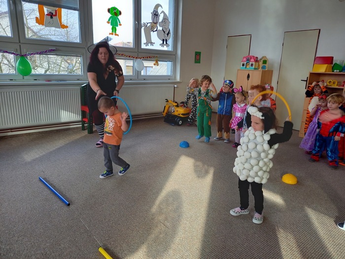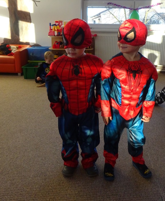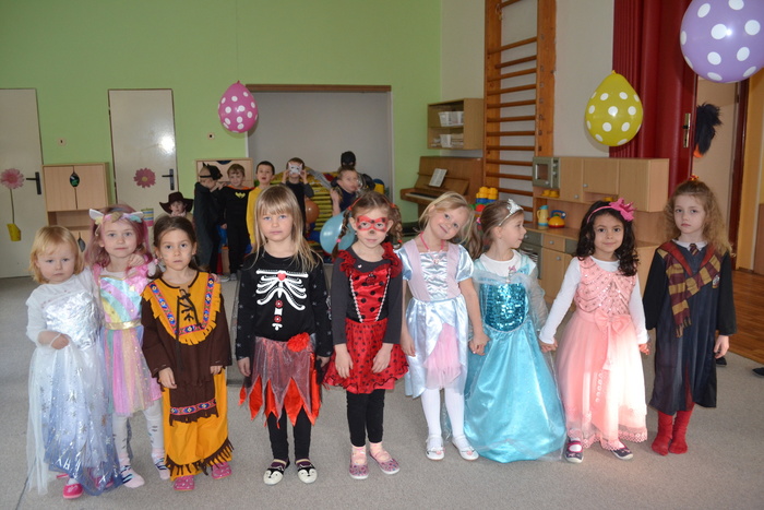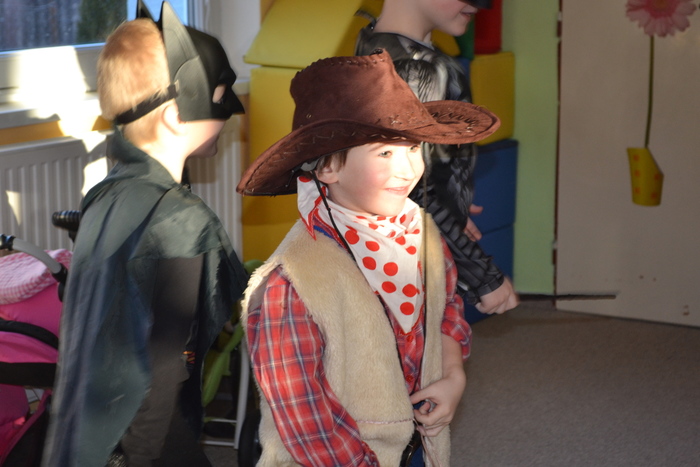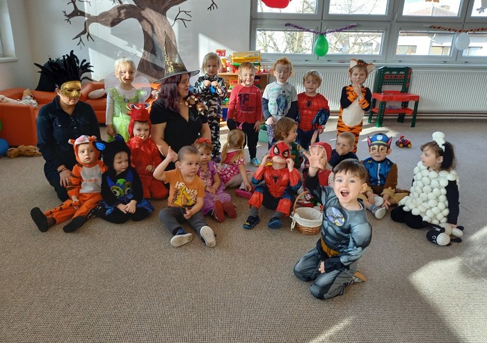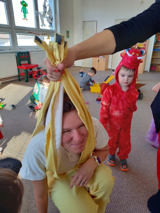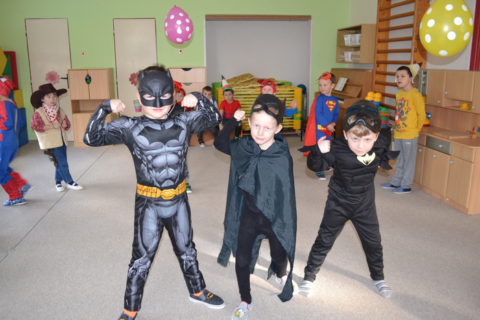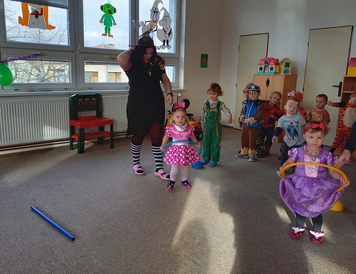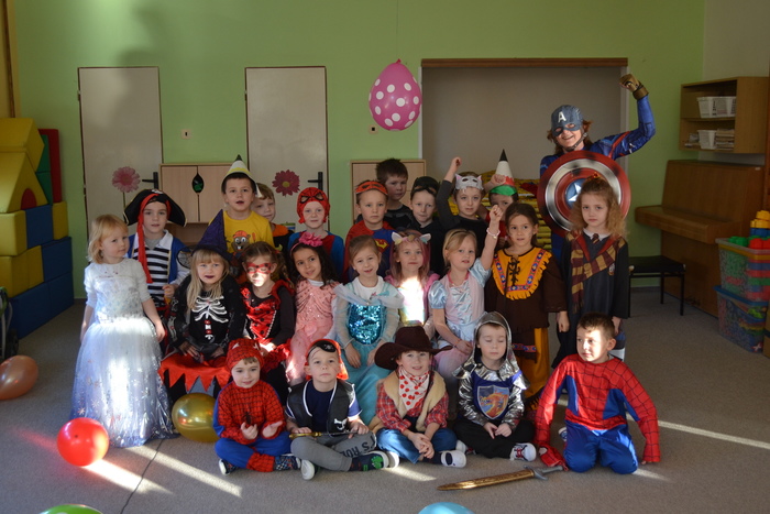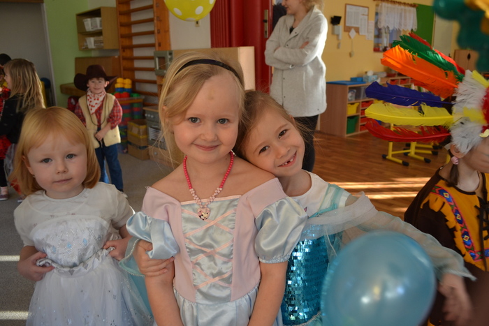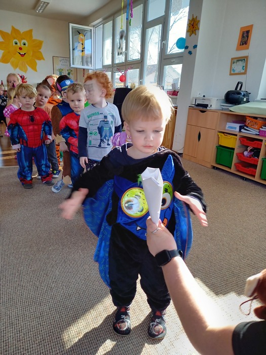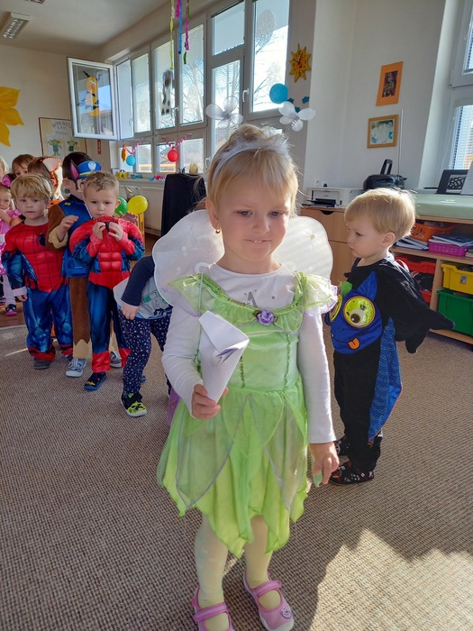Všimli jste si, že nám školku stráží krásně barevná baletka? Ano, je to baletka! To jen pro některé jedince, kteří se ptali, cože je to venku za strašáka. A dnes si mohla hlavu ukroutit při pohledu na zástup princezen, spajdrmenů, betmenů a dalších menů, který se hrnul do školky. To tak bývá, když je ve vesele vyzdobené školce KARNEVAL.