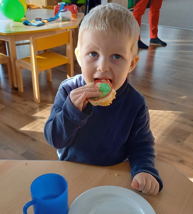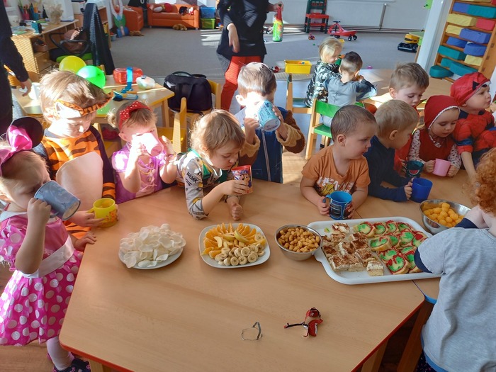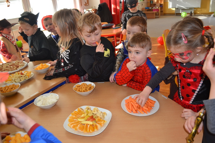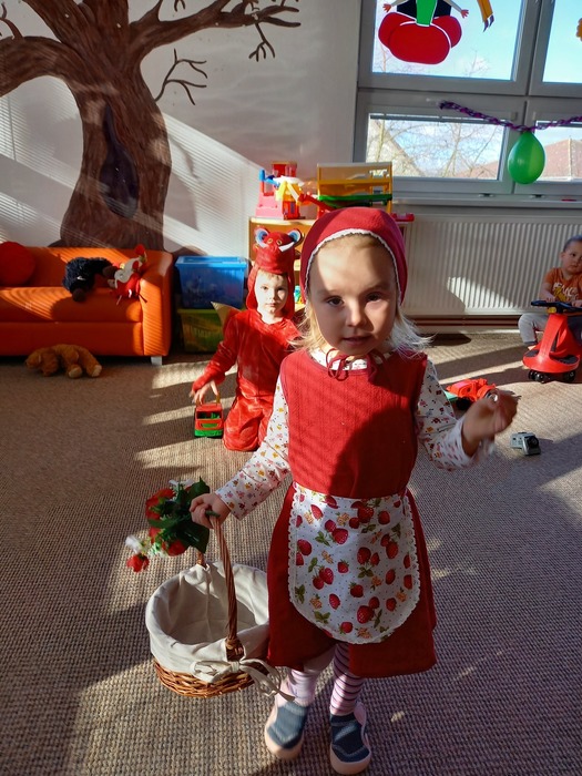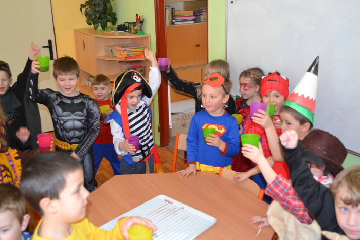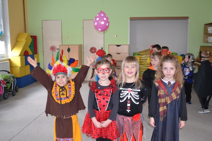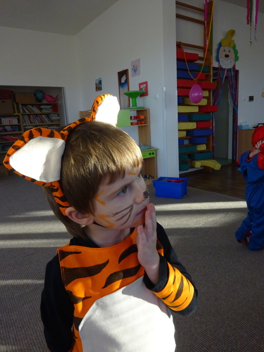 Dnes na třídách tančili, dováděli a soutěžili indiáni, vojáci, kovbojové, sem tam nějaká ta víla, námořník a dokonce i Bořek stavitel. Ovečka s Karkulkou se nemusely vlka báti, neb ten nedorazil. Ale raději se měly na pozoru před dvěma tygry. Vlastně tygříky, kteří se nechali rádi podrbat za uchem. Ani drak nevypadal, že by si slupl nějakou tu princeznu ke svačině. Možná měl pupek napraný dobrotami, které nám připravily tety kuchařky. To jsme tedy byli překvapeni, že to i v kuchyni hýří karnevalovými barvami. Barvy se dostaly dokonce i do výborné bábovky.