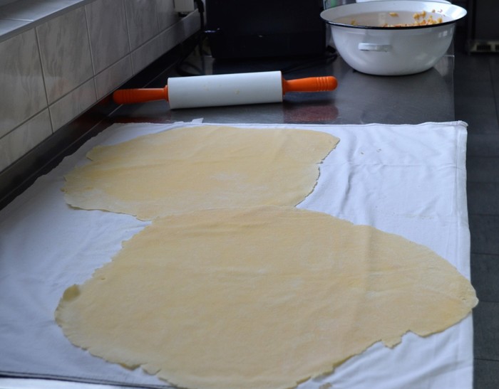 Jemně propracujeme, těsto nesmí být hladké. Rozdělíme na dva díly a vyválíme. Spodní díl posypeme jablky a skořicí. Druhým dílem přiklopíme. Nebo lze i srolovat a je z toho závin. Štrůdl či závin - věčné dohadování a správném názvu nás baví :-).
